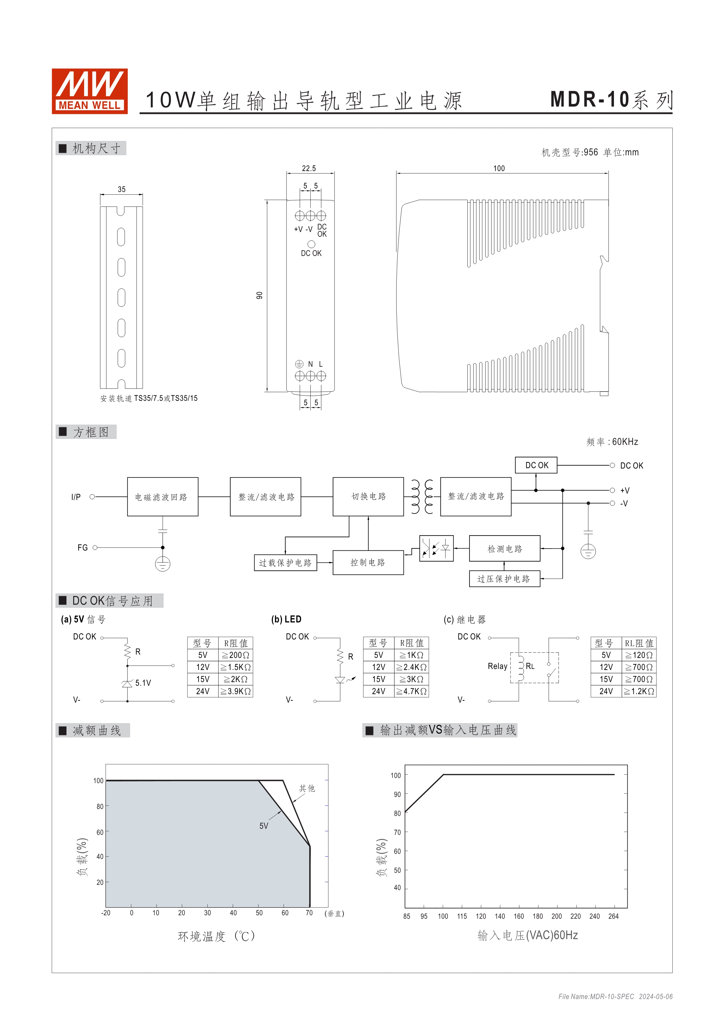 超薄型塑料機殼 單相,全范圍輸入 空載待機消耗瓦數(shù)<0.75W~1W 適合安裝于DIN rail TS-35 / 7.5 或 15 內(nèi)建主動式功率因子矯正功能(active PFC) DC OK訊號輸出(MDR-10/20) DC OK繼電器接點(relay contact)信號輸出(MDR-40/60/100) 適用于Class I, Div 2 T4危險區(qū)域(MDR-40/60)