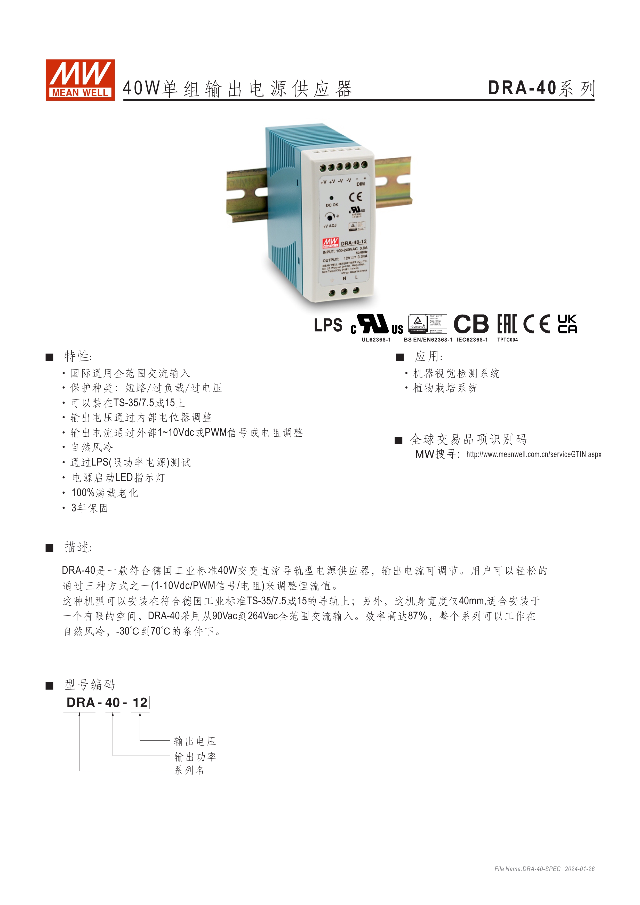 塑料機(jī)殼 單相,全范圍輸入 輸出電流可透過1~10VDC, PWM信號或電阻調(diào)設(shè)于原額定值的 10~100% 適合安裝于DIN Rail TS-35 / 7.5或15 適合于視覺檢測設(shè)備及植物栽培系統(tǒng)