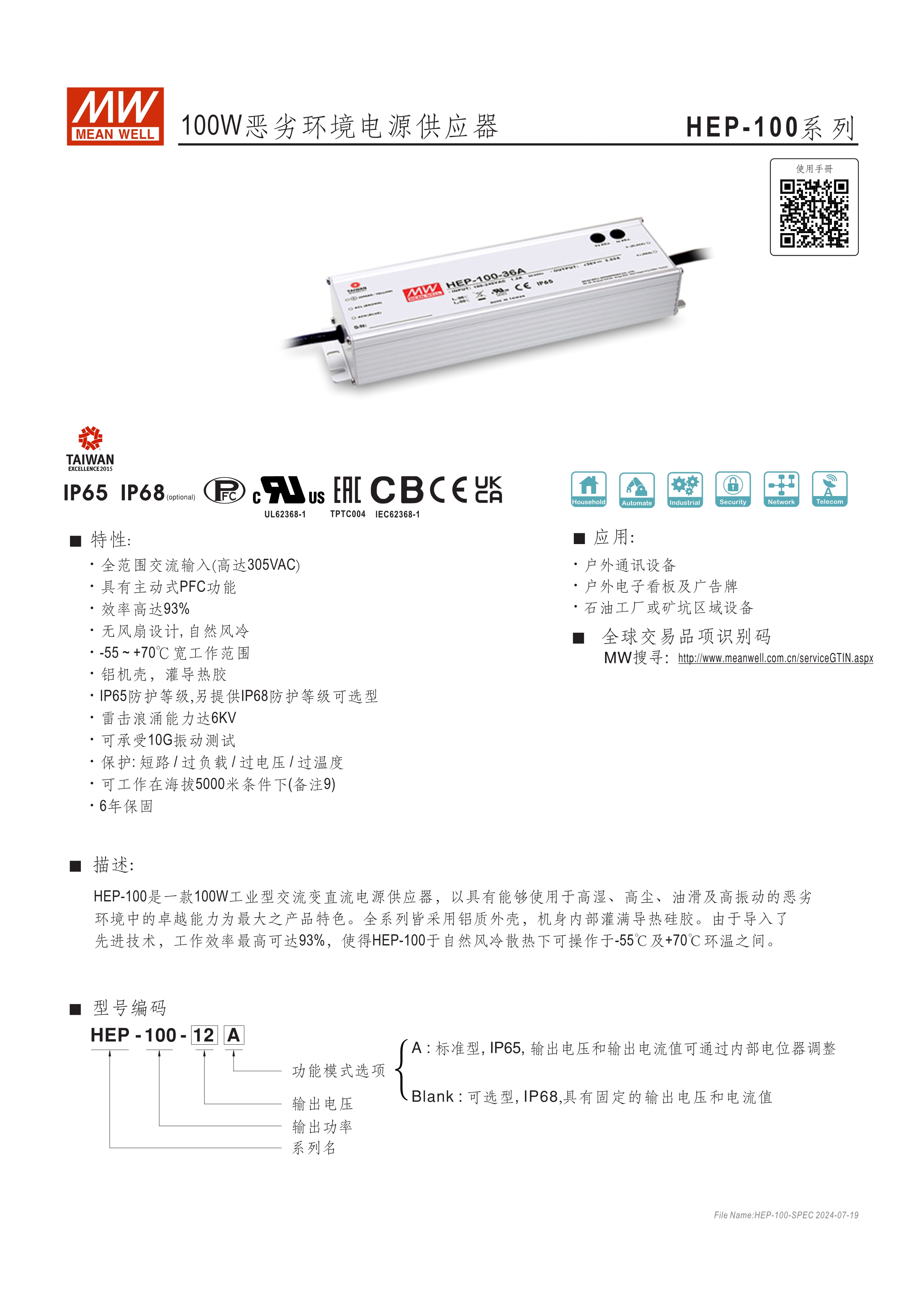 無風(fēng)扇設(shè)計(jì) 具96%超高效率 工作溫度范圍寬達(dá)-55~+70℃ 采用金屬外殼、IP65設(shè)計(jì)(另有IP68選購機(jī)型),可承受10G震動(dòng)測試 操作海拔高度可達(dá)5000公尺 內(nèi)建CANBus、PMBus,可選MODBus (僅1000W和2300W可提供) 適用于高溫/低溫、高塵、高濕、高震動(dòng)、高鹽分的戶外或嚴(yán)苛環(huán)境 6年保固期