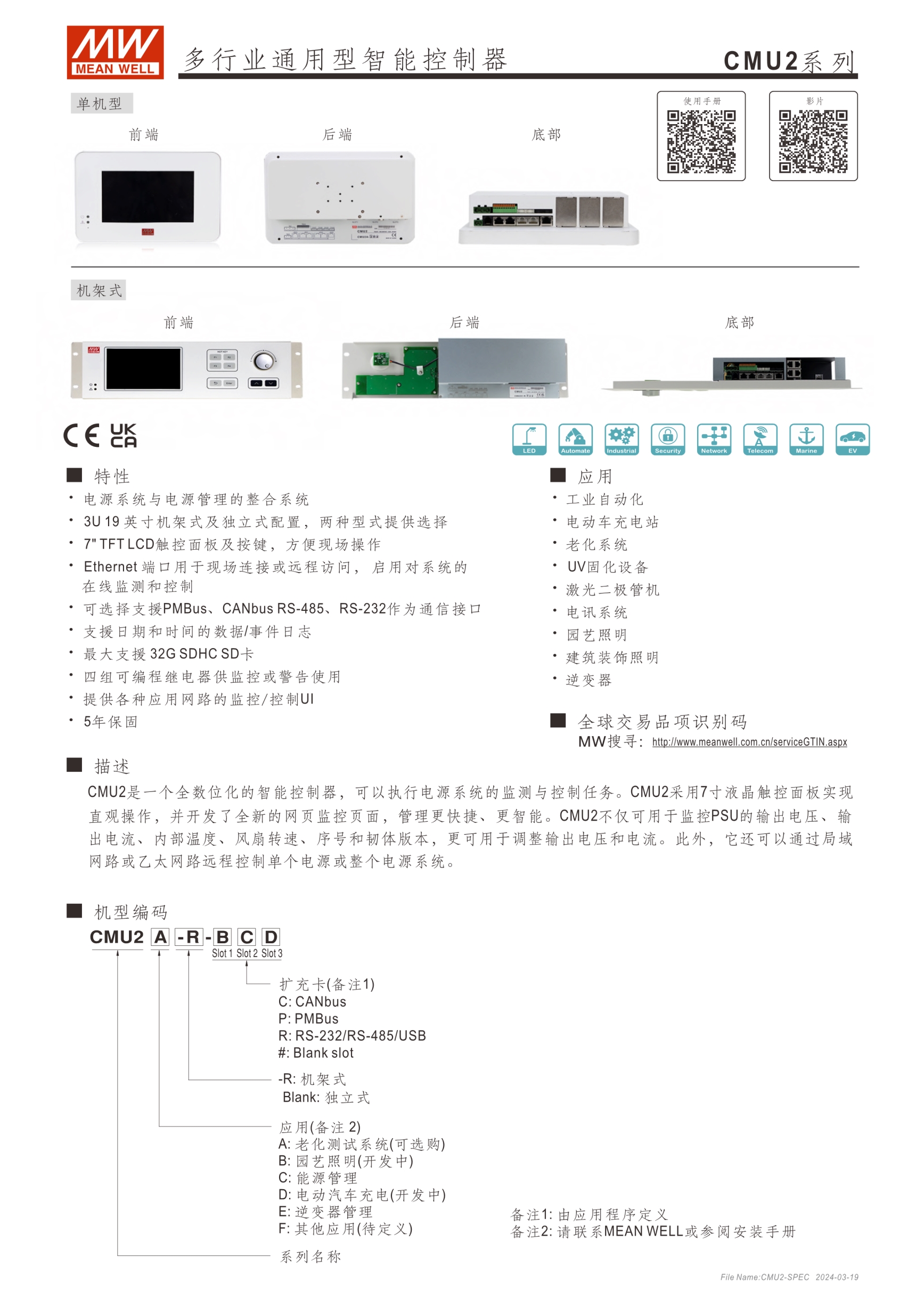 電源系統(tǒng)與電源管理的整合系統(tǒng) 3U 19英吋機(jī)架式及獨(dú)立式配置,兩種型式可選擇 7" TFT LCD觸控面板及按鍵,方便現(xiàn)場(chǎng)操作 Ethernet端口用于現(xiàn)場(chǎng)連接,或遠(yuǎn)程訪問(wèn),啟用對(duì)系統(tǒng)的在線監(jiān)測(cè)和控制 可選擇支援PMBus CANbus, RS-485, RS-232作為通信接口 提供各種應(yīng)用網(wǎng)路的監(jiān)控、控制UI