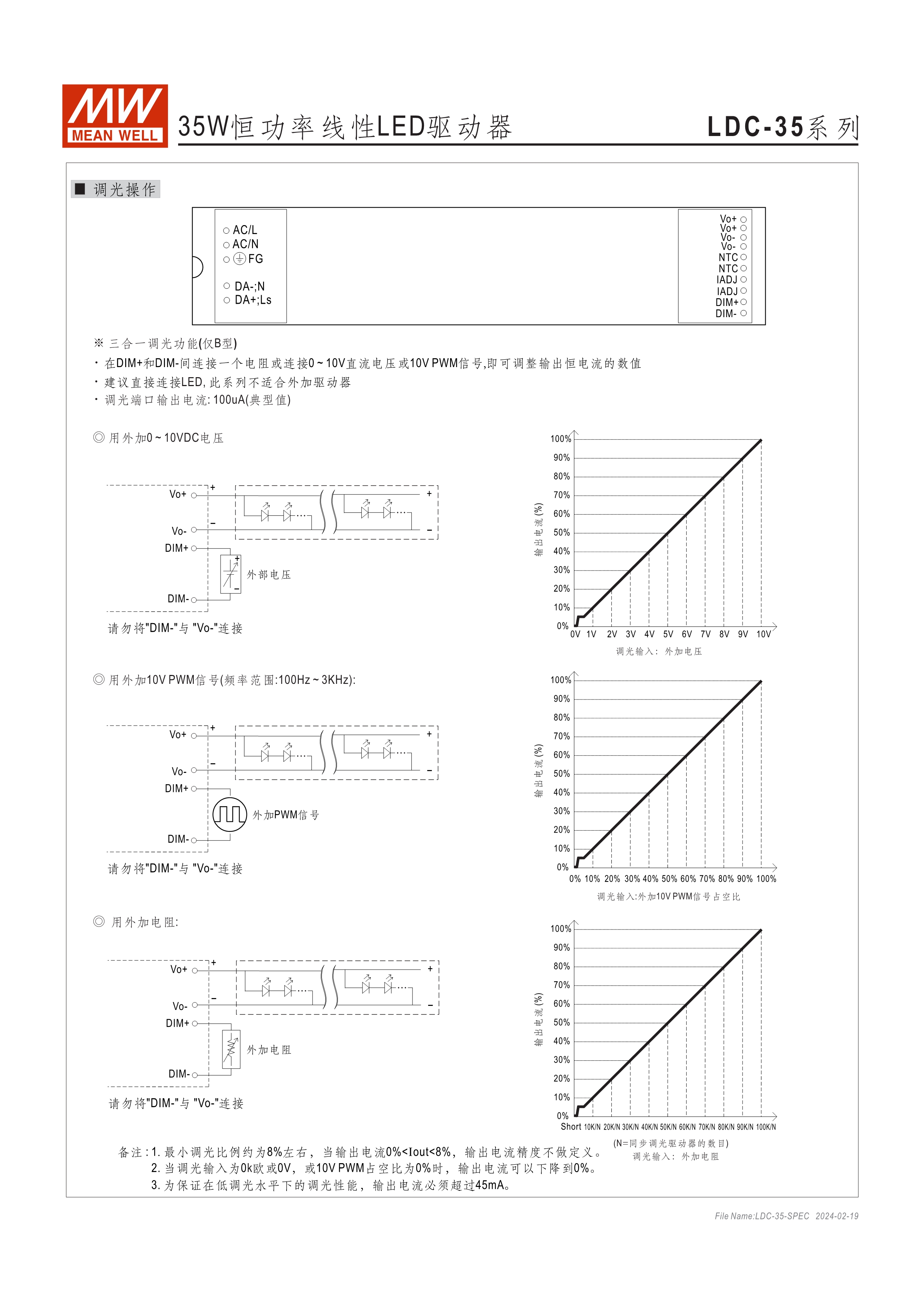 恒功率模式輸出,輸出電流可通過外接電阻設(shè)定 無頻閃設(shè)計(jì)(Fpcker free) 三合一調(diào)光功能:0~10Vdc、PMW調(diào)光、電阻調(diào)光 內(nèi)建主動(dòng)式功率因子矯正功能(Active PFC) 低空載功耗: <0.5W 工作溫度: -25~+90℃ 保護(hù)種類:短路 UL/ENEC/TUV/CCC/CB/CE 認(rèn)證齊全 5年保固