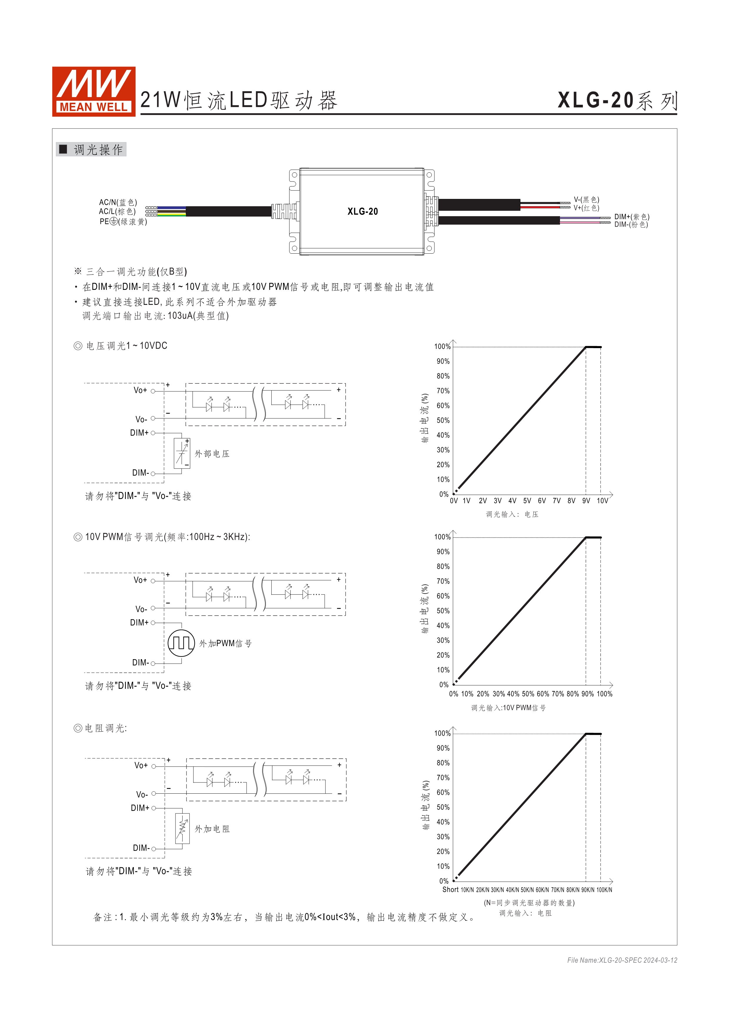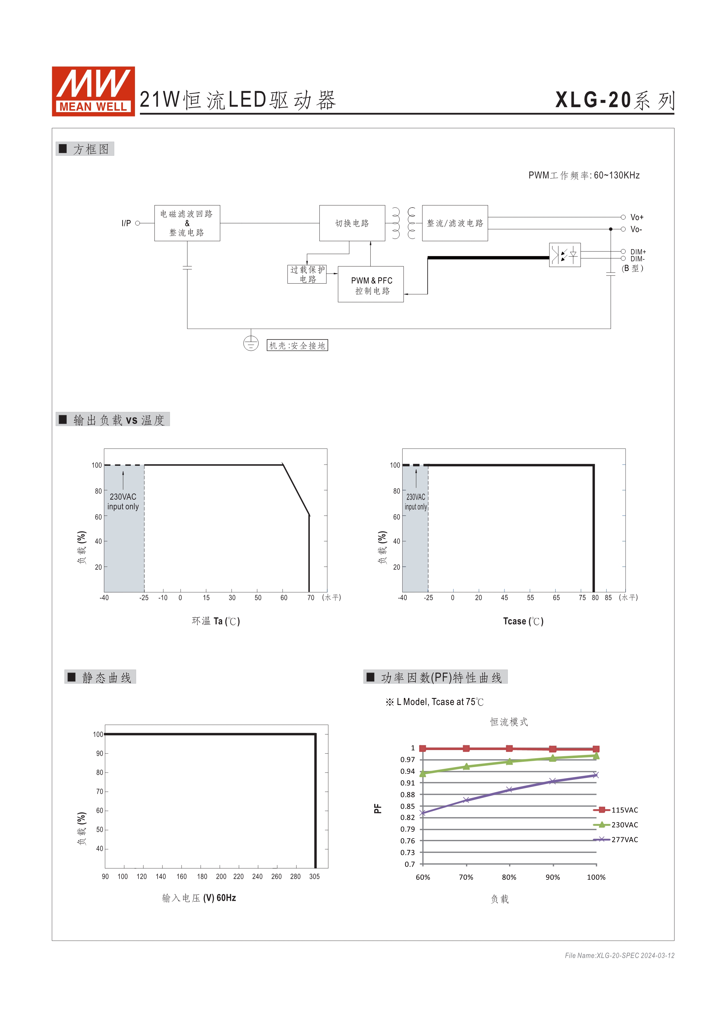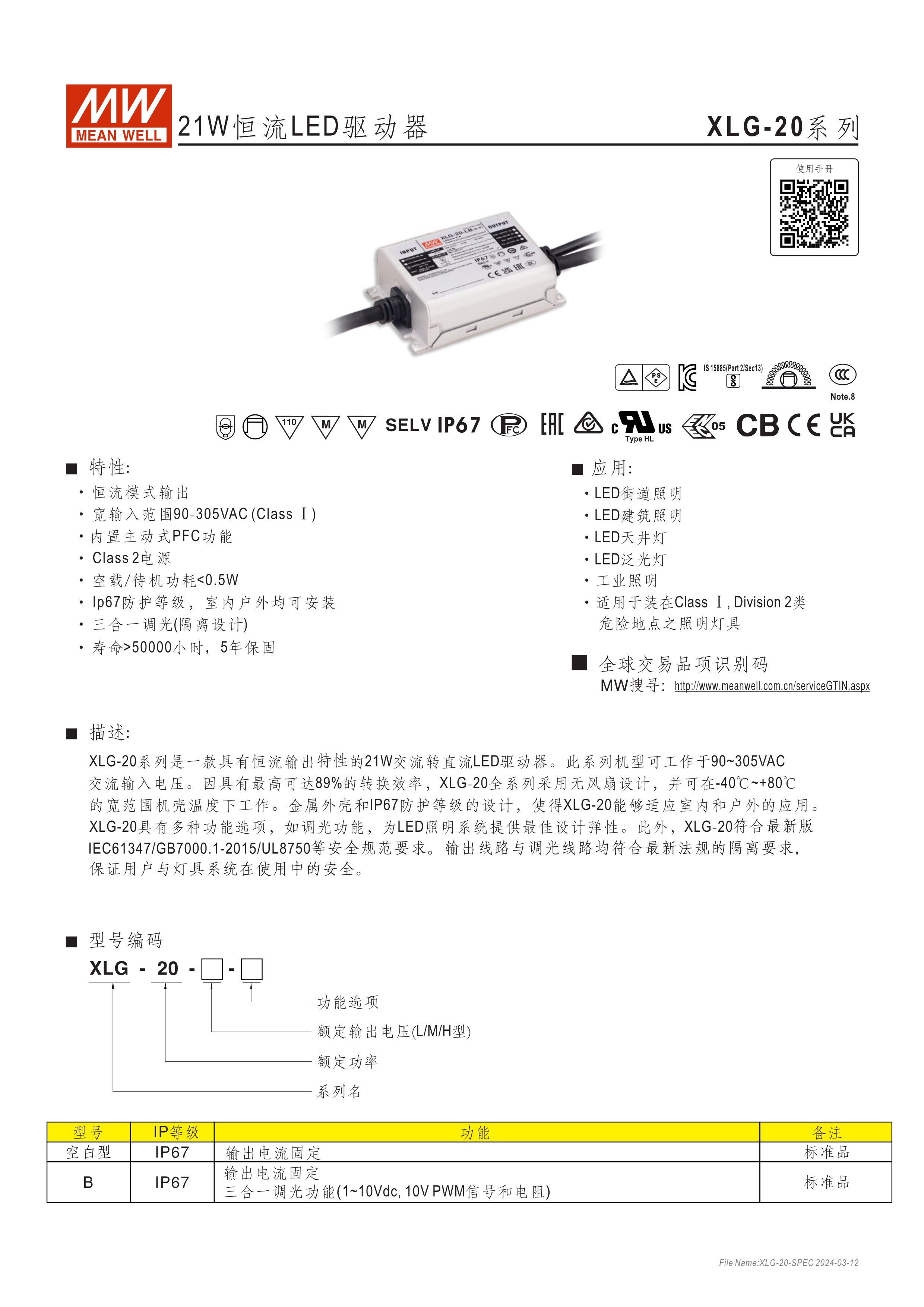 寬電壓輸入范圍100~305VAC (XLG-20為90~305VAC) 寬電流輸出可調(diào)整恒功率設(shè)計 (XLG-20為恒流模式) 主動式PFC設(shè)計及輸出效率可達90% 調(diào)光功能: 三合一 / DALI 保護功能:短路、過電壓、過溫度 雷擊保護耐壓設(shè)計6KV(L/N-FG)/4KV(L-N); XLG-20為4KV(L/N-FG)/2KV(L-N) 5年保固