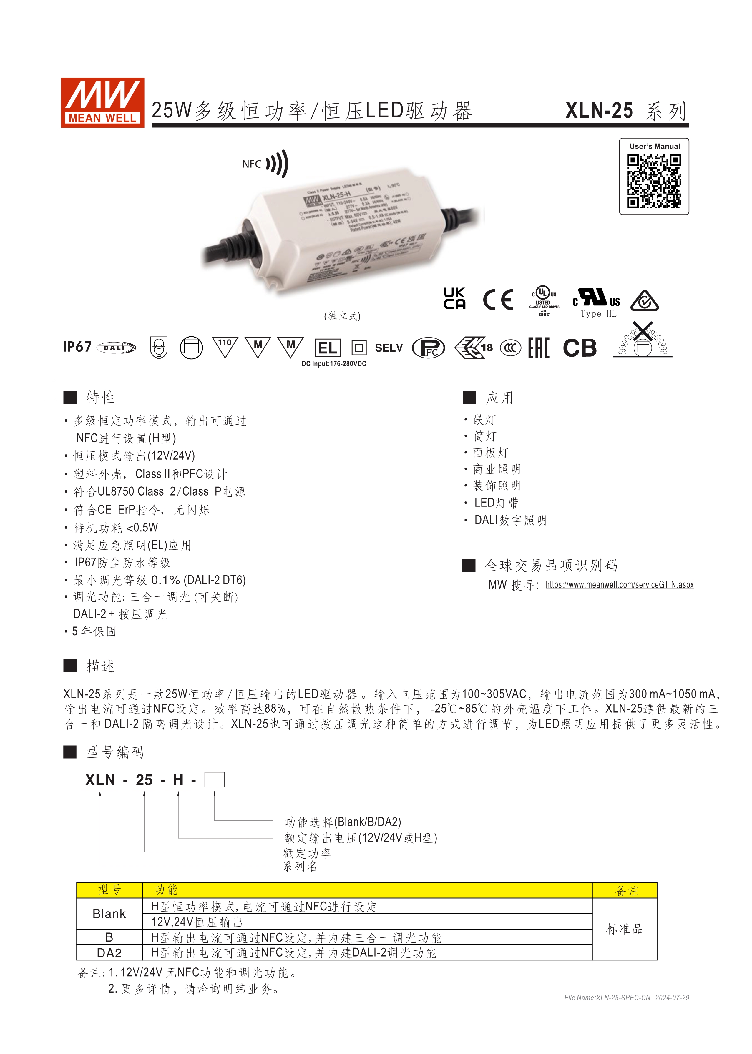 恒功率設(shè)計(jì)可寬范圍調(diào)整輸出電流(H型) 恒壓輸出機(jī)型可選12V/24V/48V NFC感應(yīng)調(diào)整輸出電流(出線式) 全電壓輸入110~305V AC 具PFC功能 塑膠殼雙重絕緣及Class II/2設(shè)計(jì) 符合IEEE 1789及Erp無頻閃標(biāo)準(zhǔn) 待機(jī)功耗<0.5W 最低調(diào)光亮度<0.1% (DALI-2 DT6) 全灌封膠設(shè)計(jì)符合IP67防水防塵 符合應(yīng)急照明(EL)功能 調(diào)光功能:三合一、DALI-2:KNX、IoT(選配) 輸出與調(diào)光線路間符合隔離設(shè)計(jì) 獨(dú)立型或內(nèi)置型LED驅(qū)動(dòng)電源可選 5年保固及>50,000 hrs壽命
