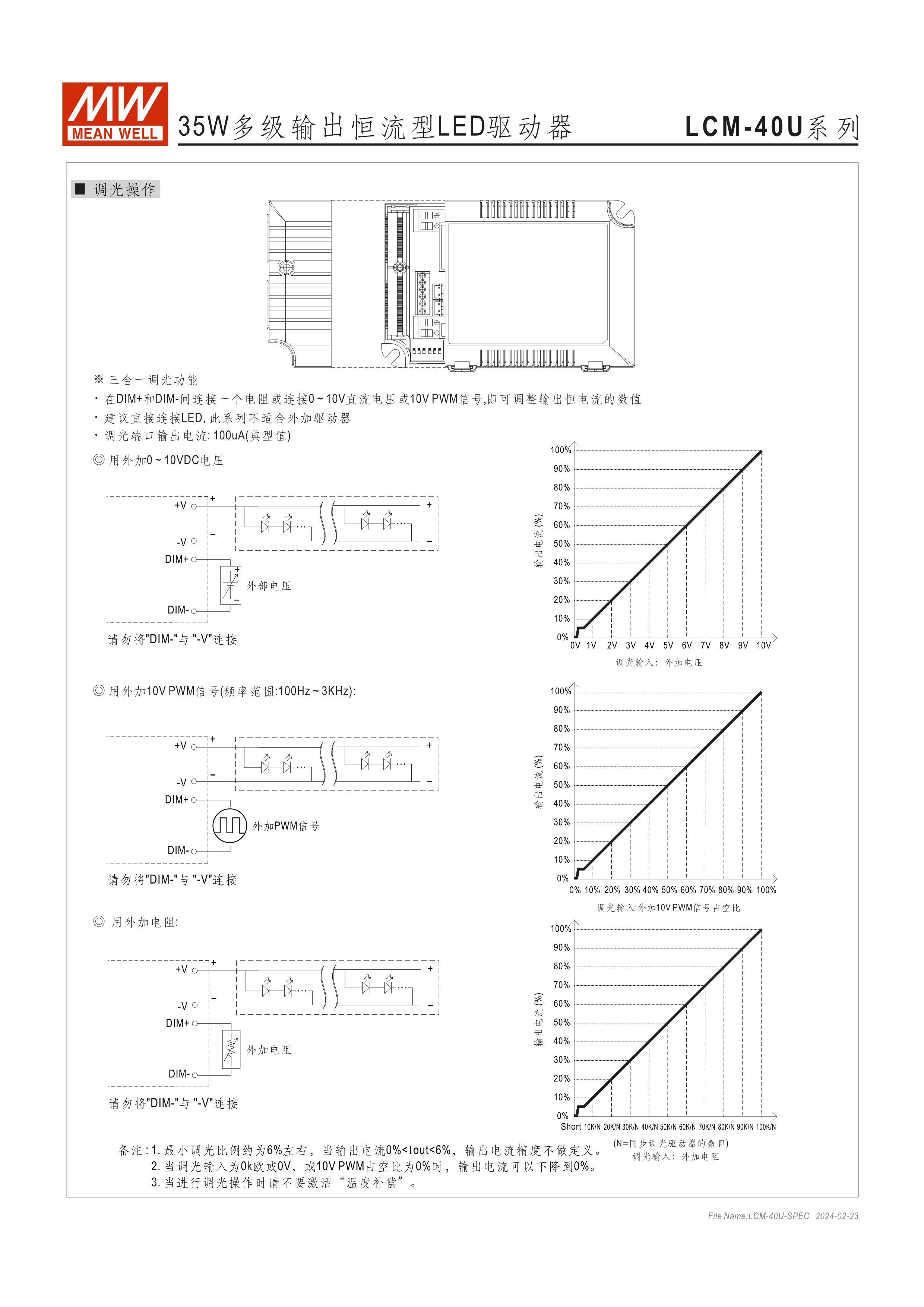 LCM-40U(DA)/60U(DA):90~132VAC交流輸入 內(nèi)建主動(dòng)式功率因子矯正功能(active PFC) 塑料外殼 可透過(guò)指撥開(kāi)關(guān)切換不同輸出電流檔位之多段式電源 LCM-40U/60U內(nèi)建三合一調(diào)光功能(0~10VDC, PWM信號(hào)或電阻,可關(guān)斷) LCM-40UDA/60UDA內(nèi)建DALI接口 和按鈕調(diào)光功能(Push Dim) 適合于LED室內(nèi)照明相關(guān)應(yīng)用