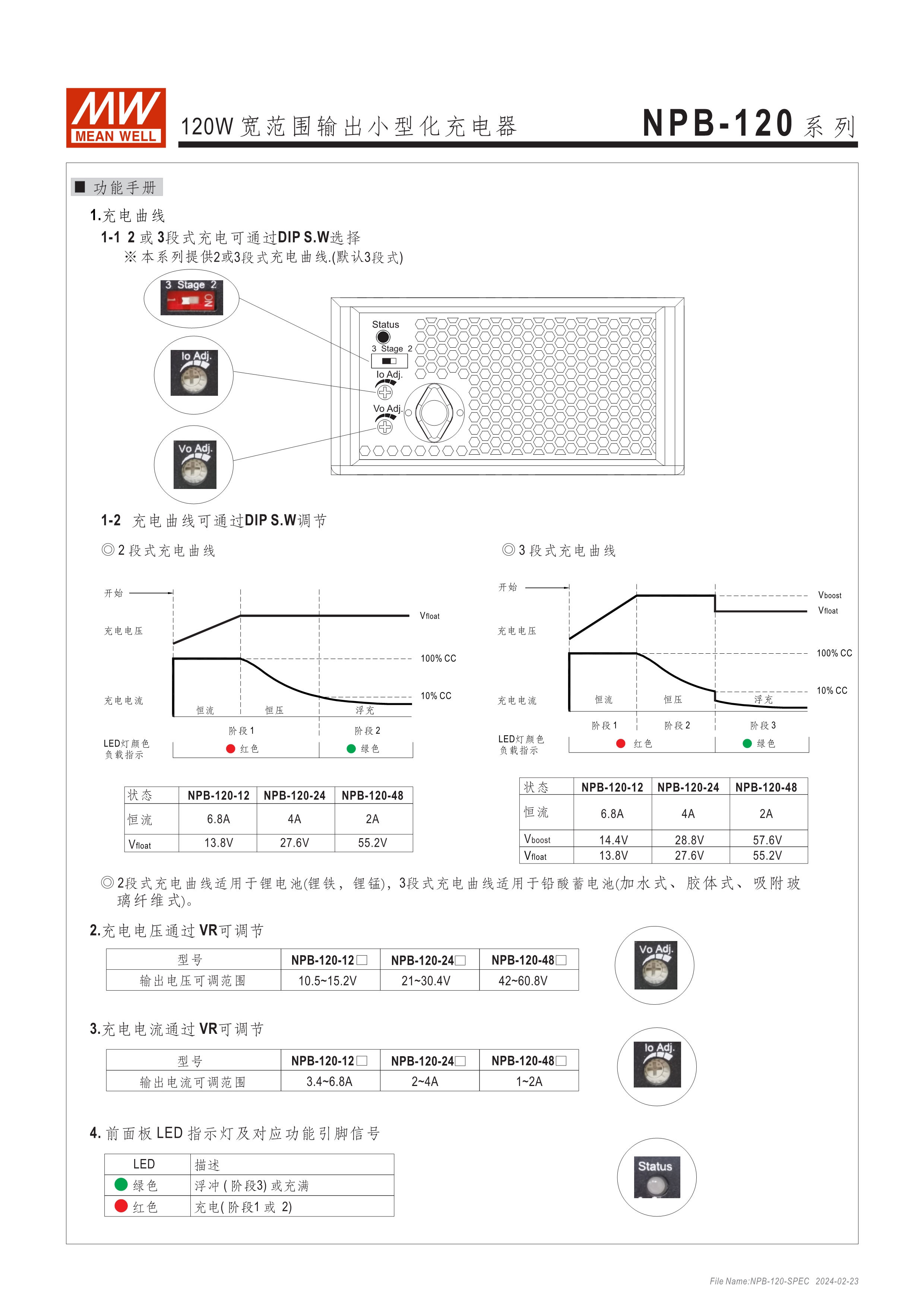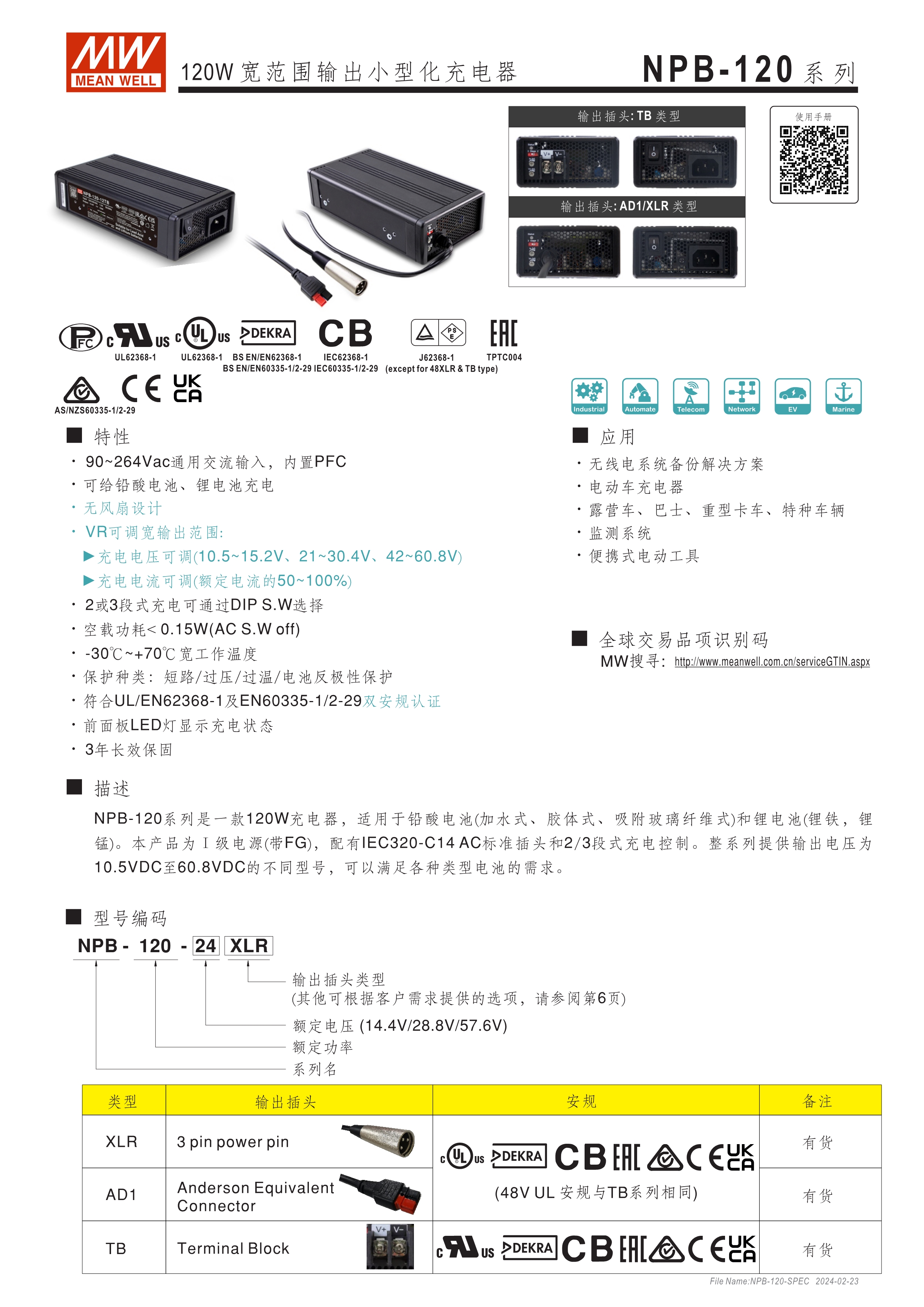 基礎(chǔ)型可靠耐用寬壓充電器 金屬殼散熱快、使用不燙手 可調(diào)功能簡(jiǎn)便、使用彈性高: ? 可調(diào)充電電壓 (由面板調(diào)整10.5~15.2V, 21~30.4V, 42~60V) ? 可調(diào)充電電流 (由面板VR調(diào)整50~100%) ? 透過(guò)面板DIP Switch可選2段或3段充電 保護(hù)功能:短路、過(guò)壓、過(guò)溫度、電池反極性保護(hù) 通過(guò)UL/EN62368-1及IEC60335-1/2-29雙安規(guī)認(rèn)證 DC輸出接頭多樣可選:Anderson、麥克風(fēng)頭、端子臺(tái) 3年保固