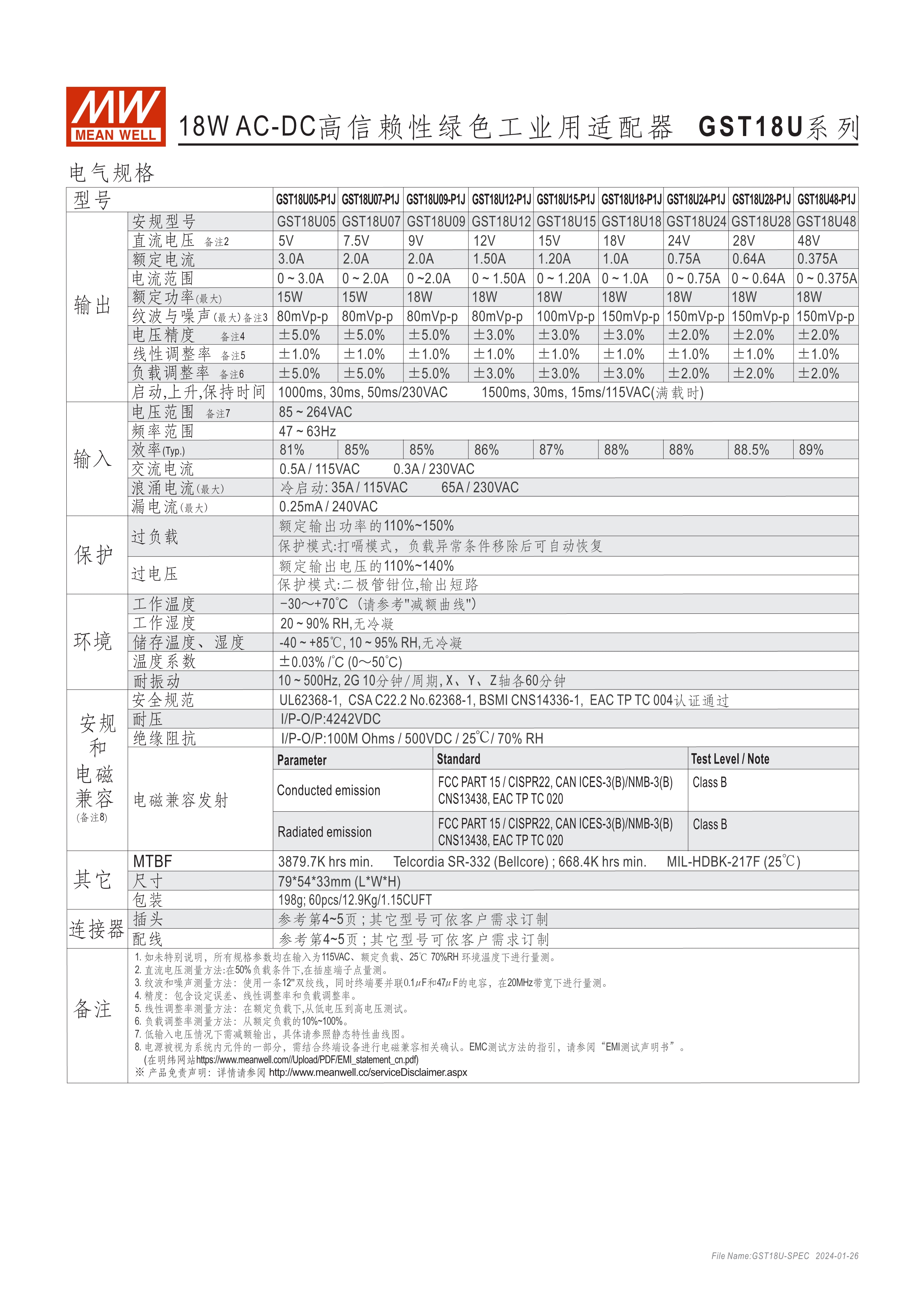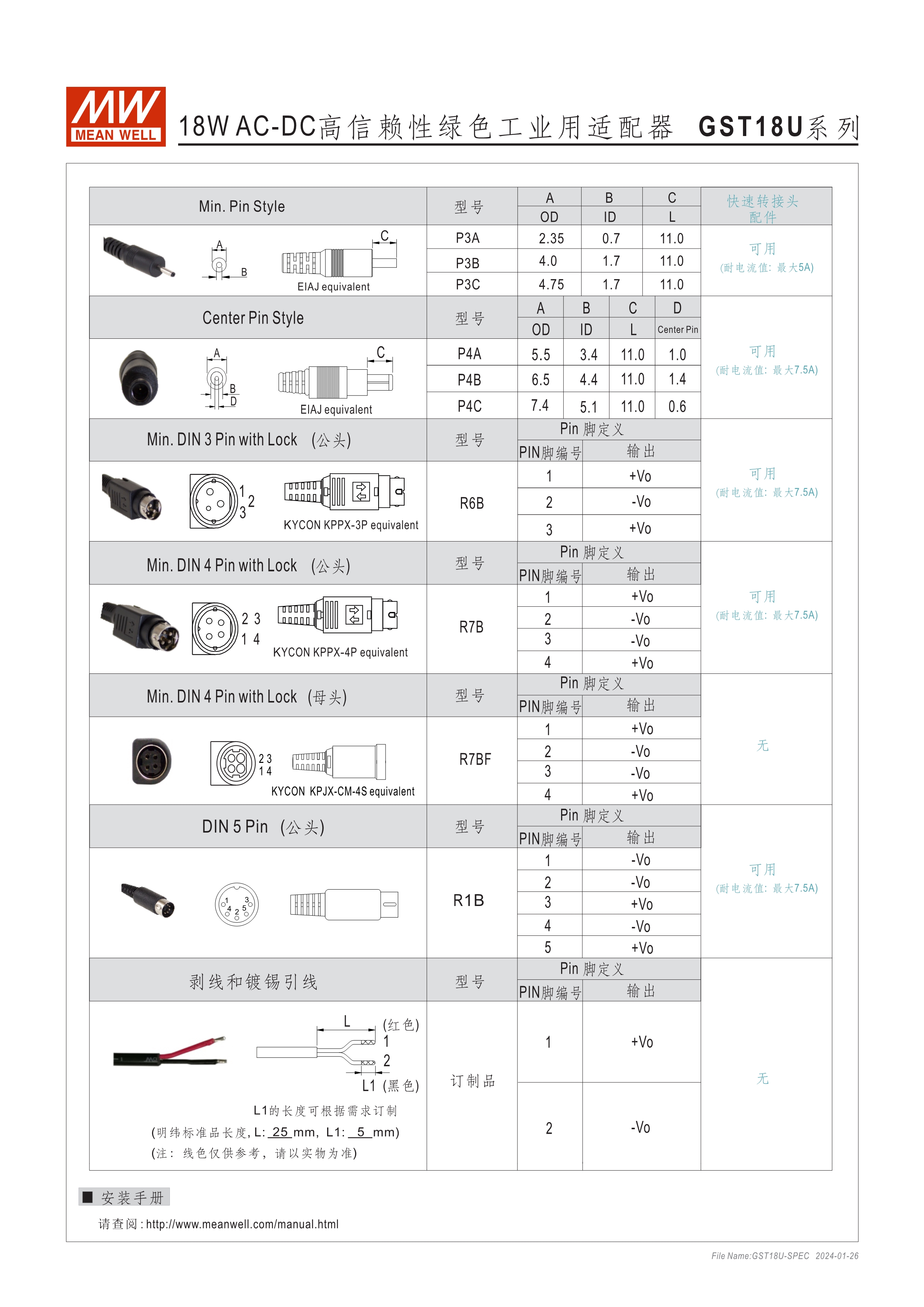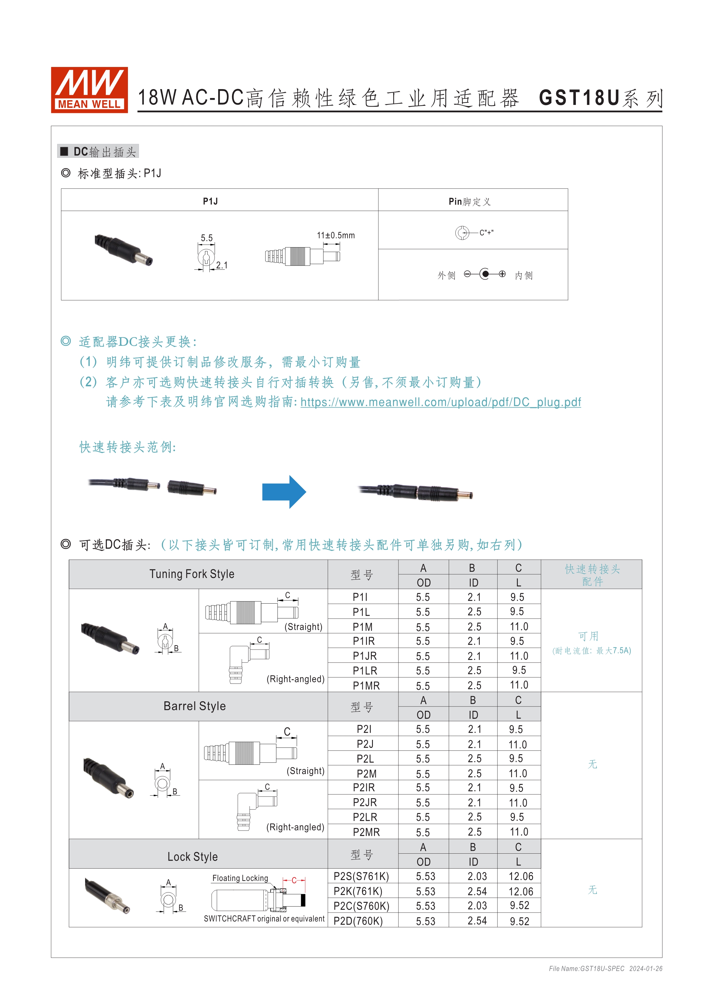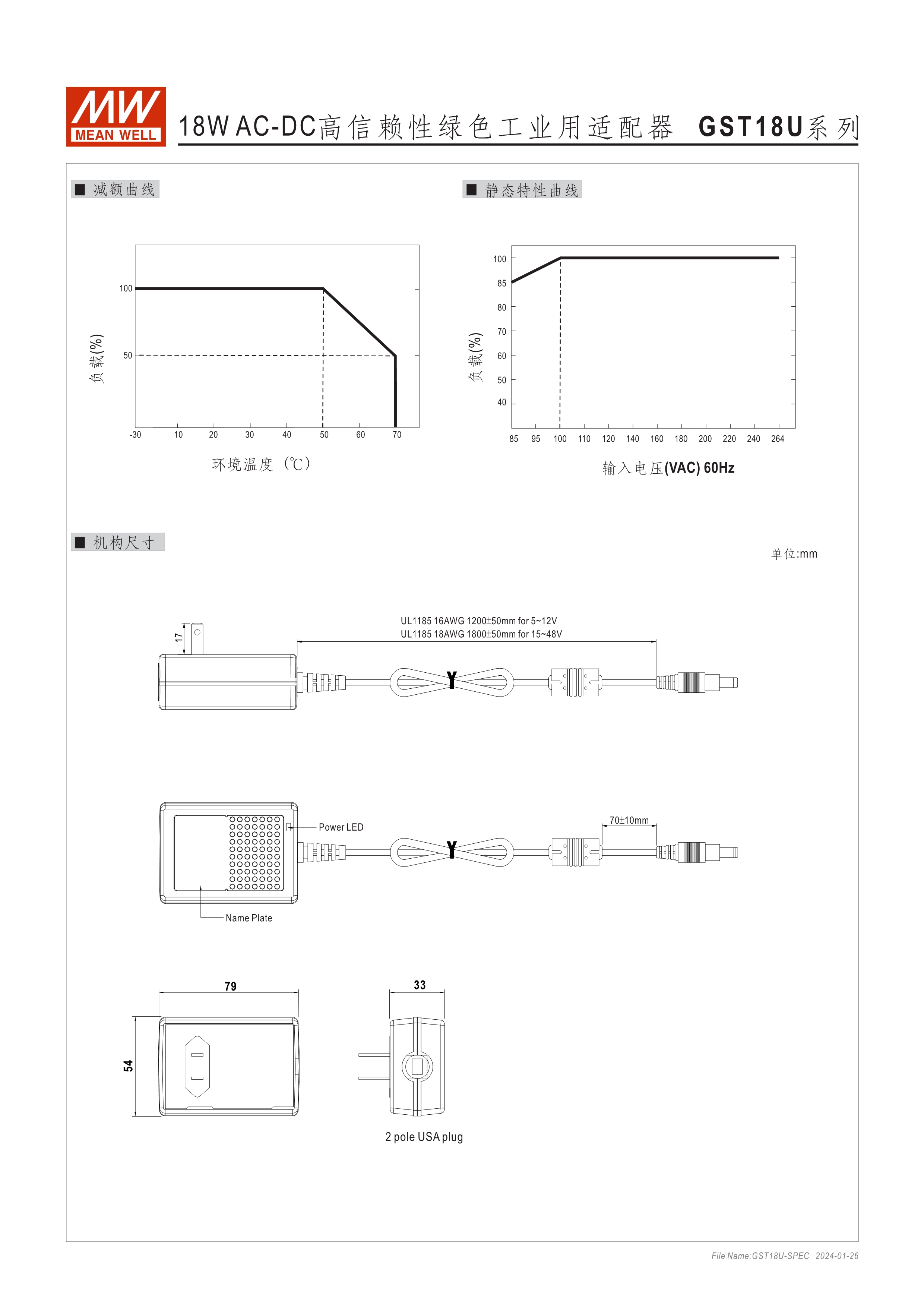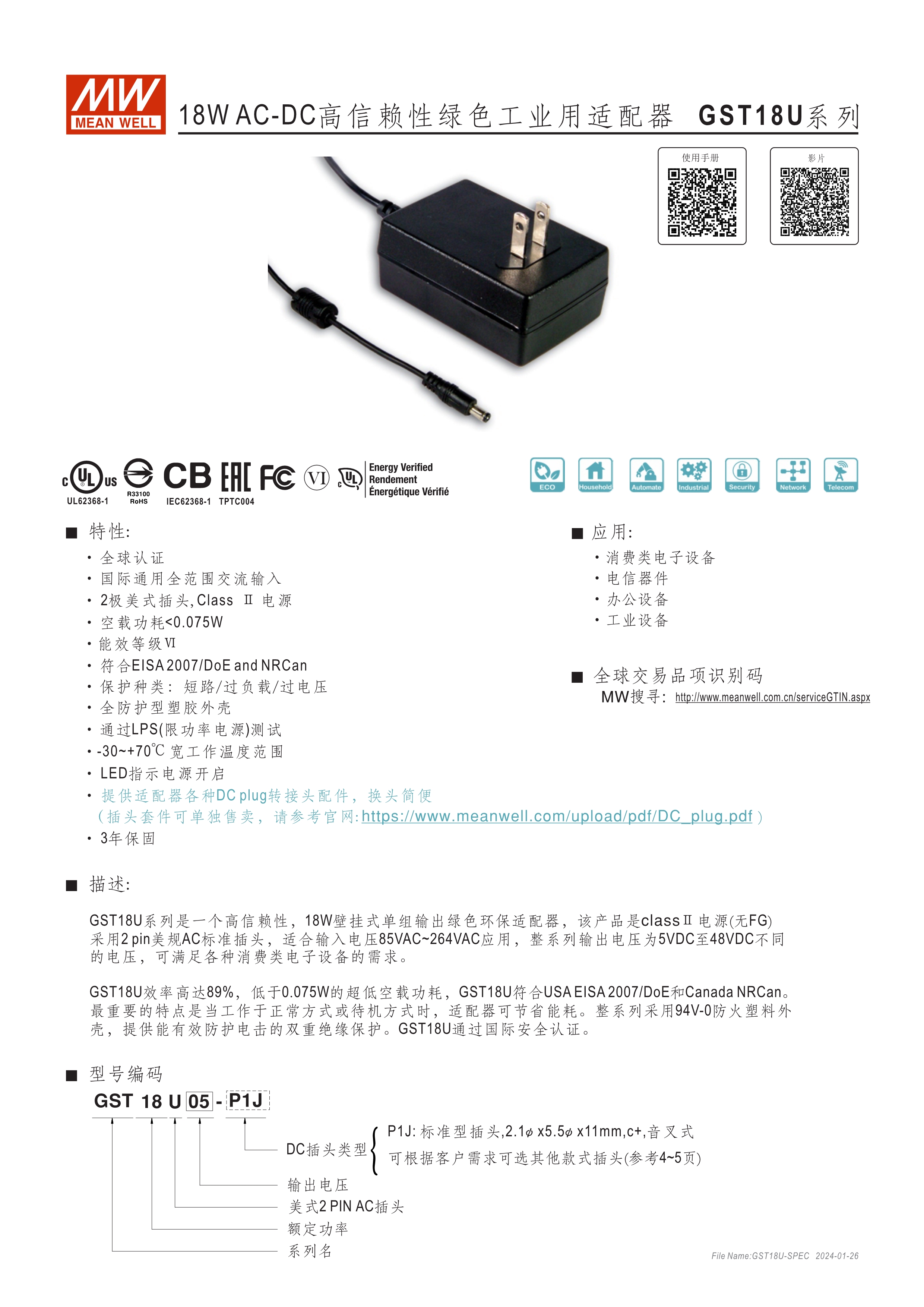通過資通訊62368-1認(rèn)證 90~264Vac輸入 空載損耗<0.075W~0.15W 能效等級Level VI 保護(hù)功能:短路、過載、過電壓 無風(fēng)扇設(shè)計(jì),工作溫度:-30~70℃ U型:2極美插,E型:2極歐插 多種DC輸出轉(zhuǎn)接頭可更換 3年保固