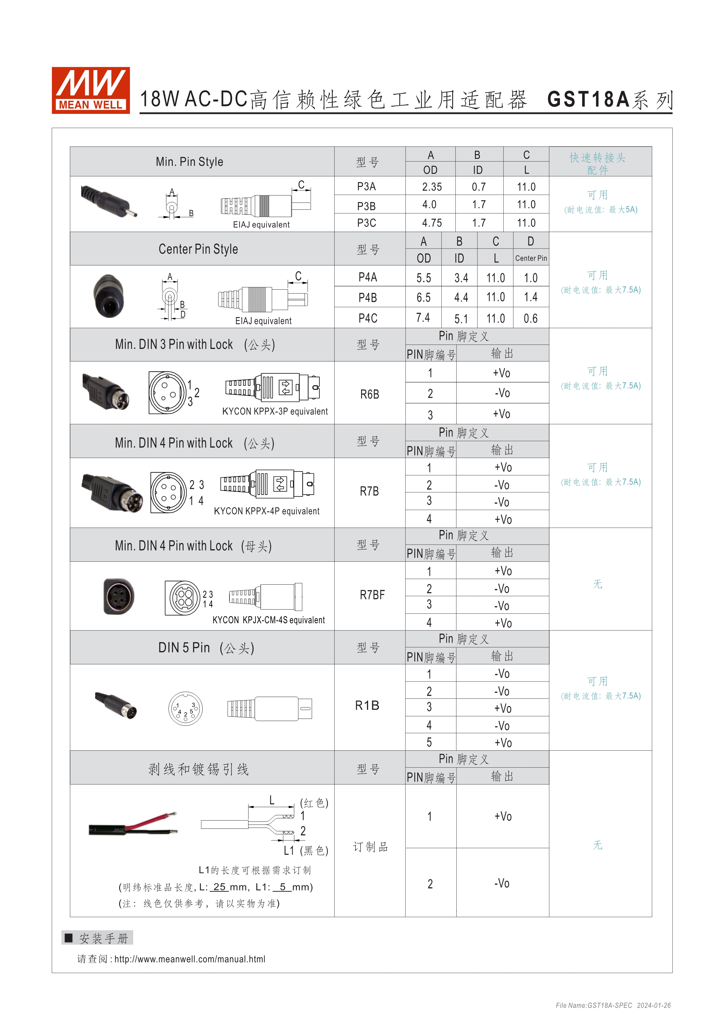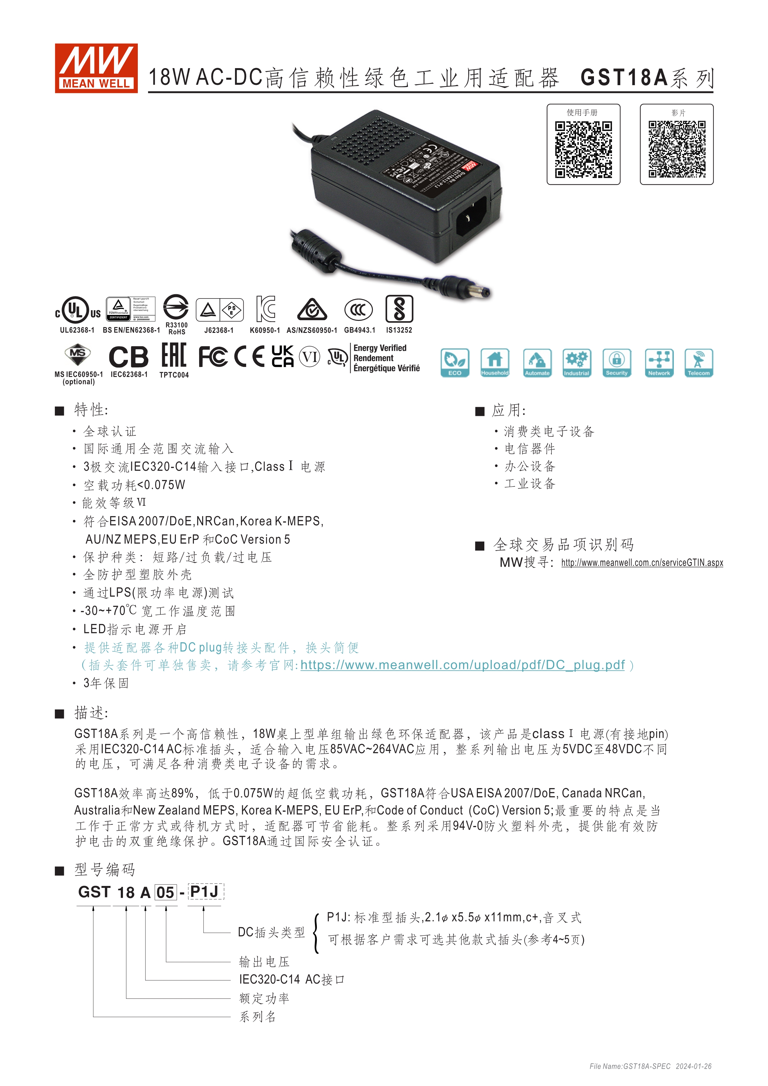 GST系列環(huán)球認(rèn)證 : UL, TUV, PSE, RCM, KC, SIRIM, BIS, EAC, BSMI, CCC 能效等級(jí)Level VI 空載損耗<0.075W~0.5W 無(wú)風(fēng)扇設(shè)計(jì),工作溫度:-30~70oC A型:Class I 電源(有接地PIN),IEC 320-C14接口; B型:Class II 電源(無(wú)接地PIN),IEC 320-C8接口 多種DC輸出轉(zhuǎn)接頭可更換 3年保固期