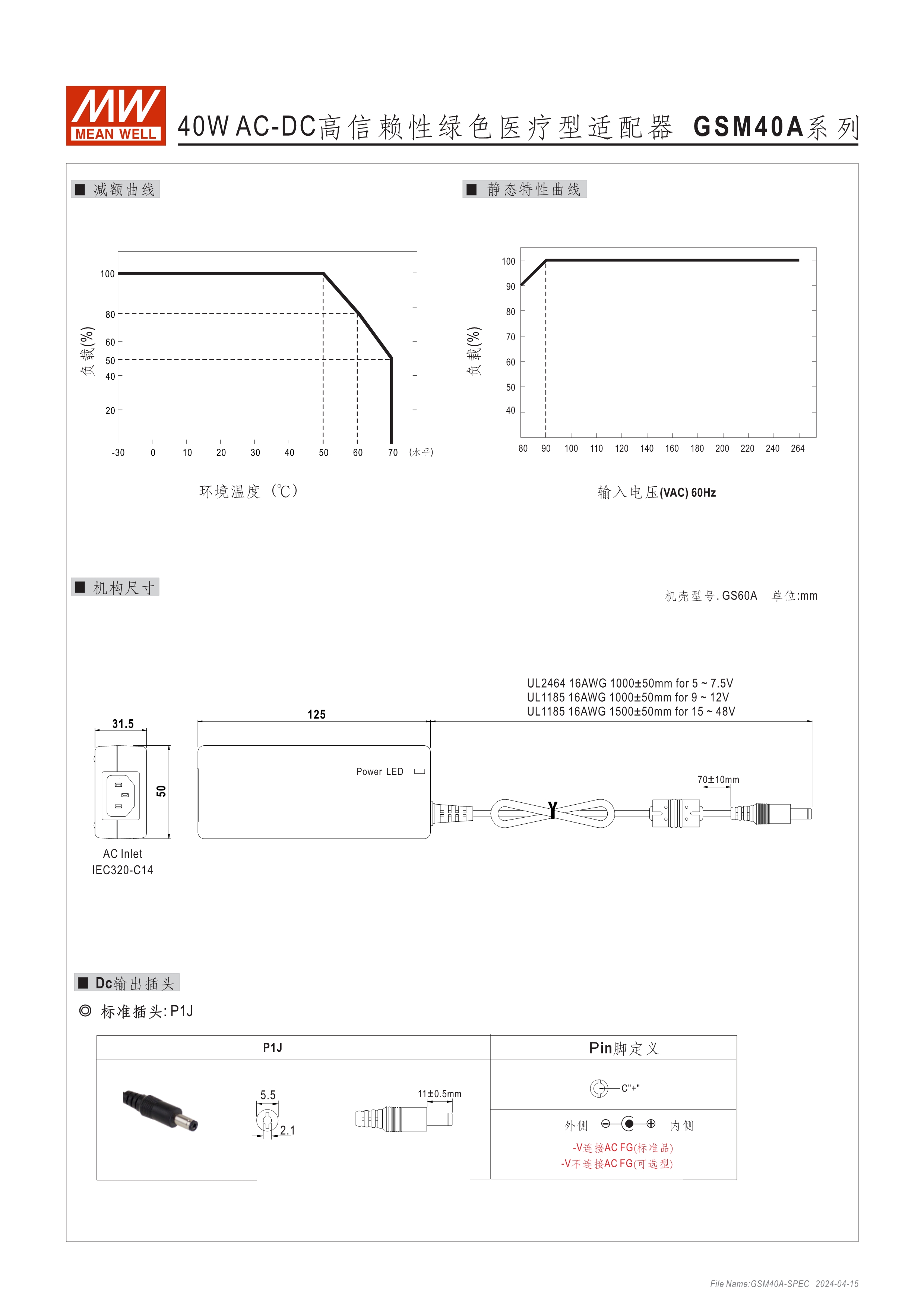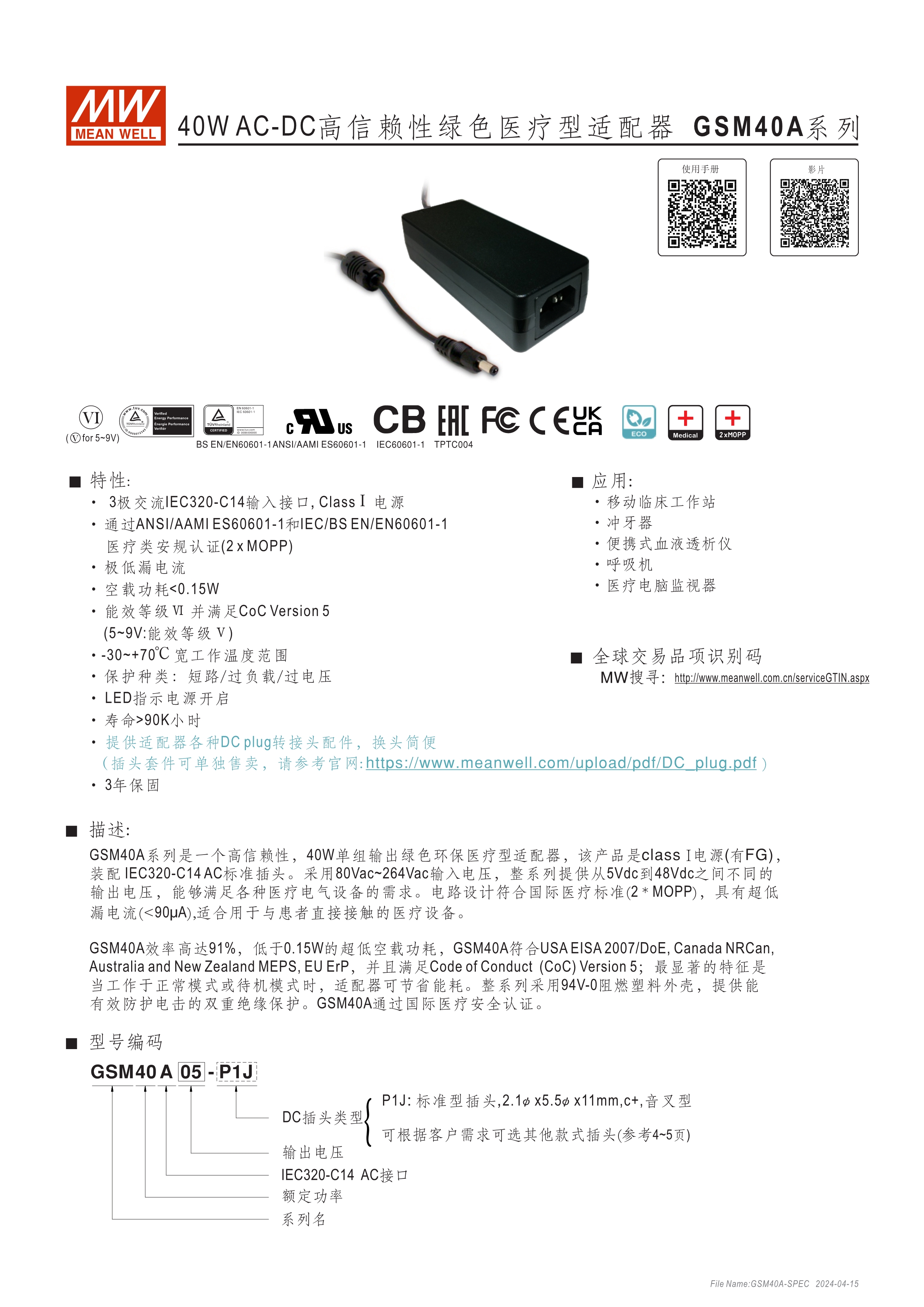通過醫(yī)療60601-1認(rèn)證(2xMOPP),BF應(yīng)用(僅B型) 能效 VI 級 空載損耗<0.1W~0.15W 符合EISA/DoE、NRCan、ErP 及CoC Version 5 A型:Class I 電源(有接地PIN),IEC 320-C14接口 B型:Class II 電源(無接地PIN),IEC 320-C8接口 極端漏電流<50~175uA(依型號) -30~+70℃工作溫度 多種DC輸出轉(zhuǎn)接頭可更換 3年保固