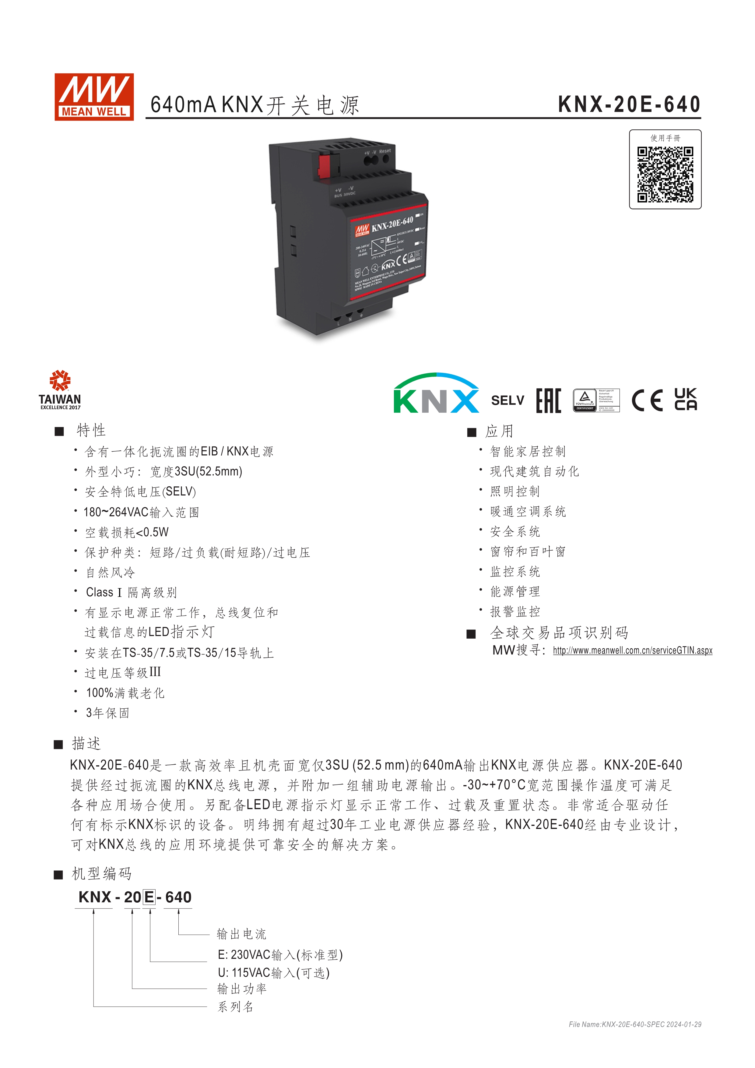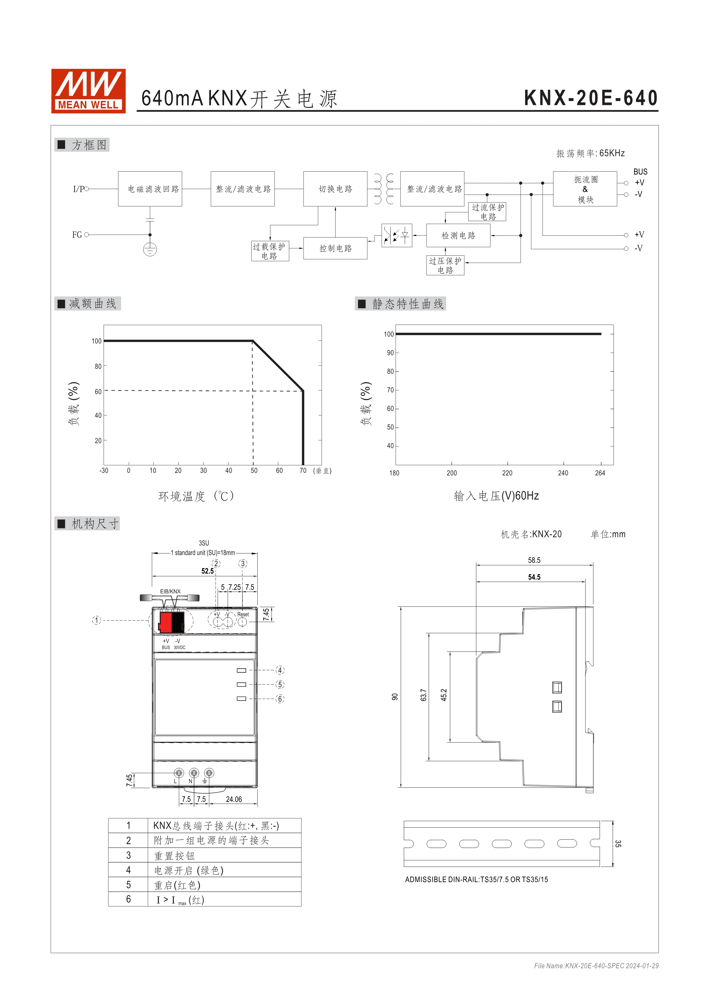 EIB/KNX 電源供應(yīng)器(具積體電感) 單相, 180~264VAC input 輸入范圍 空載待機消耗瓦數(shù)<0.5W 適合安裝于DIN Rail TS-35 / 7.5或15