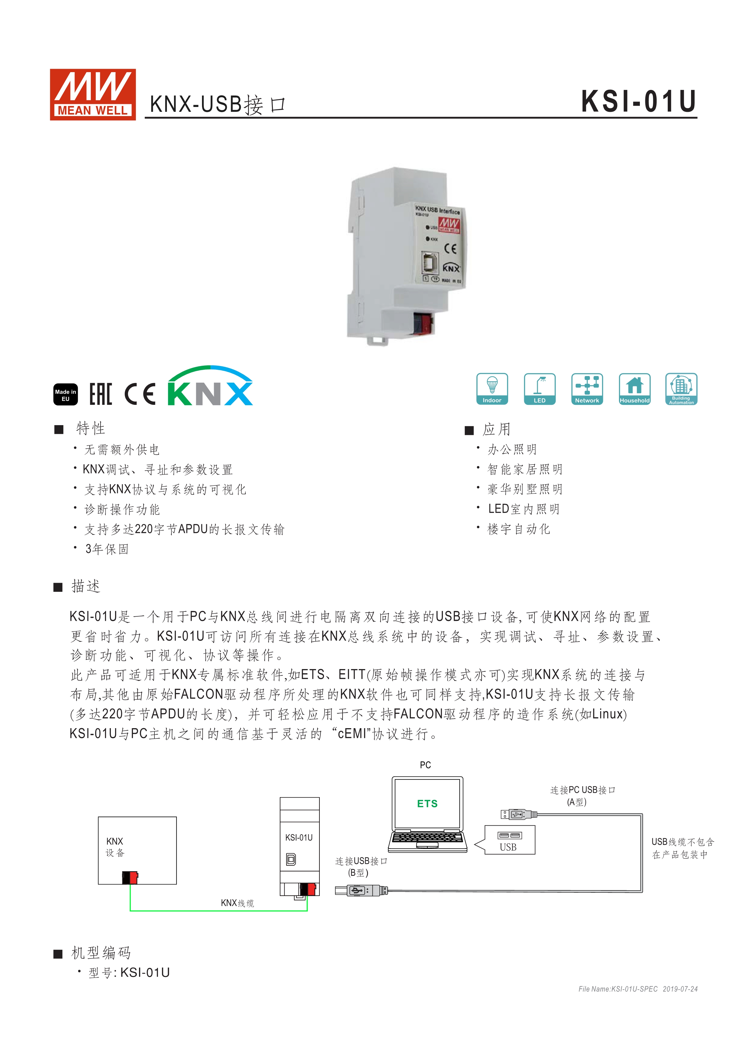 KNX-USB傳輸接口? 無需額外的外部電源? KNX通訊,尋址和參數(shù)設(shè)置? 支持KNX協(xié)議和可視化系統(tǒng)? 具備系統(tǒng)診斷功能? 支援 220 Byte APDU的 Long Message? 3年保固