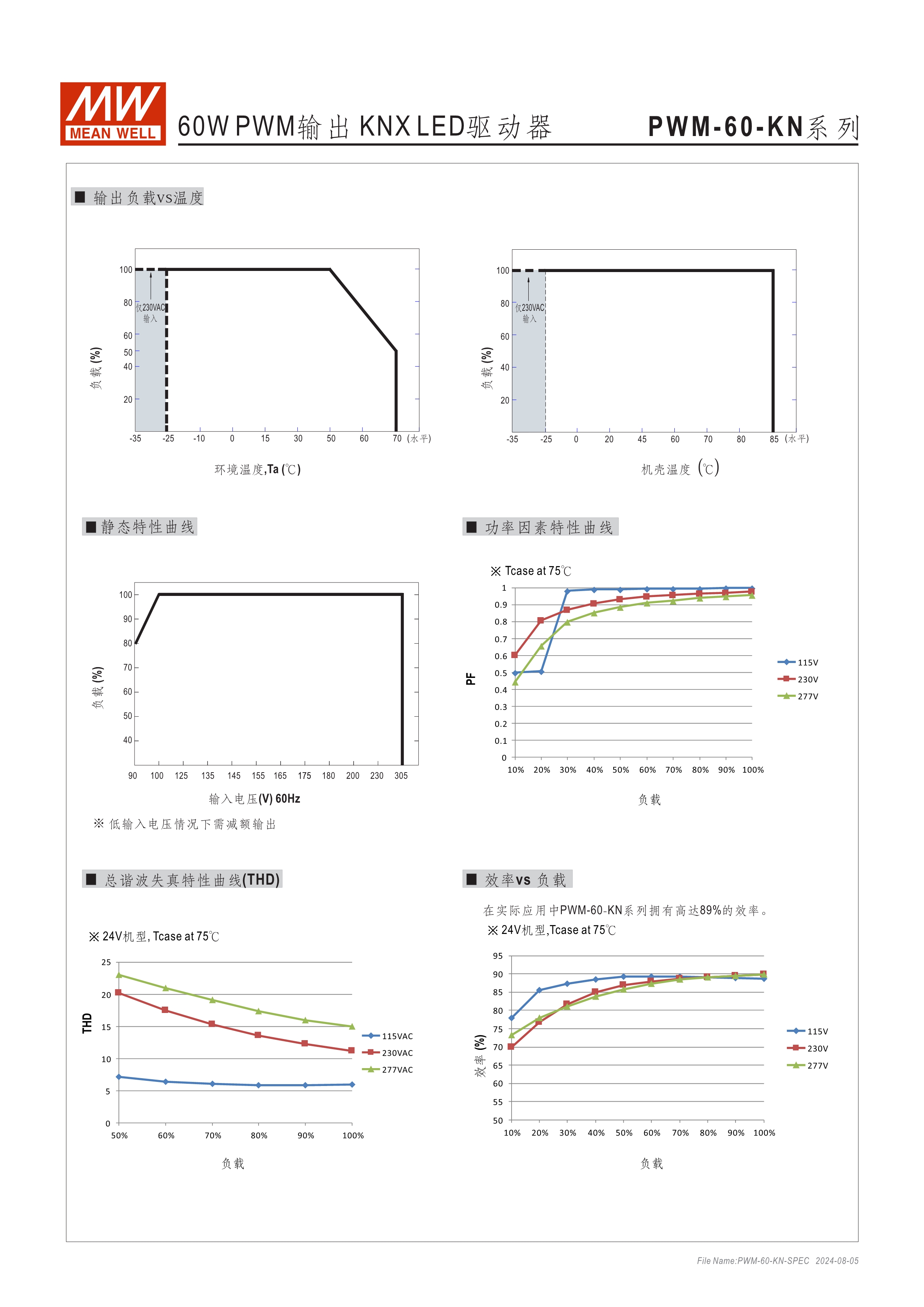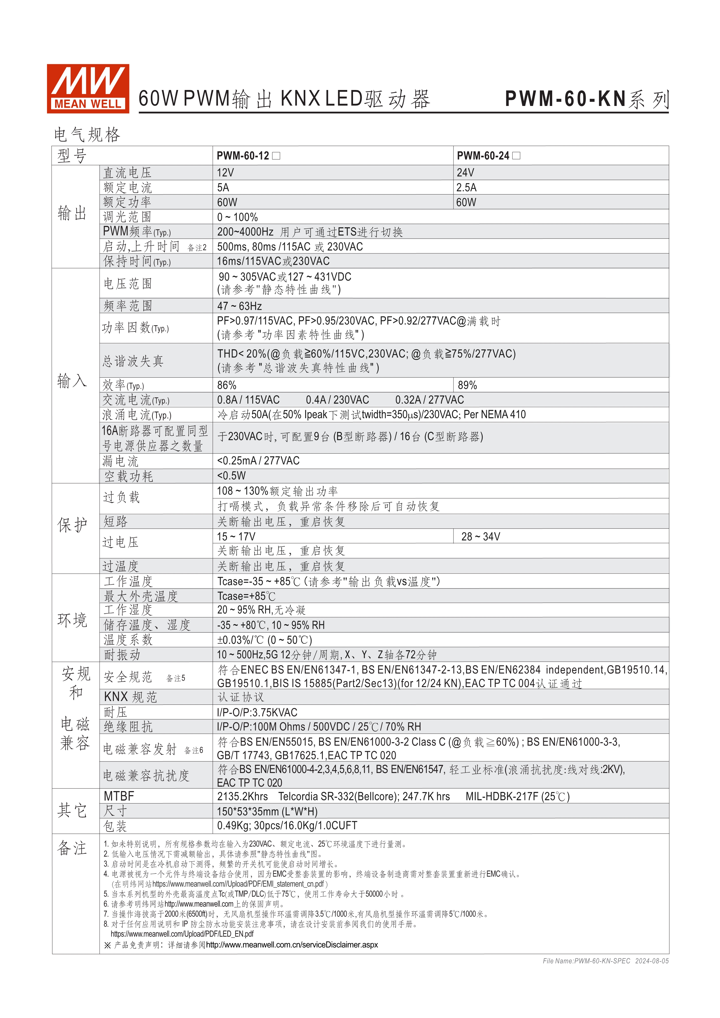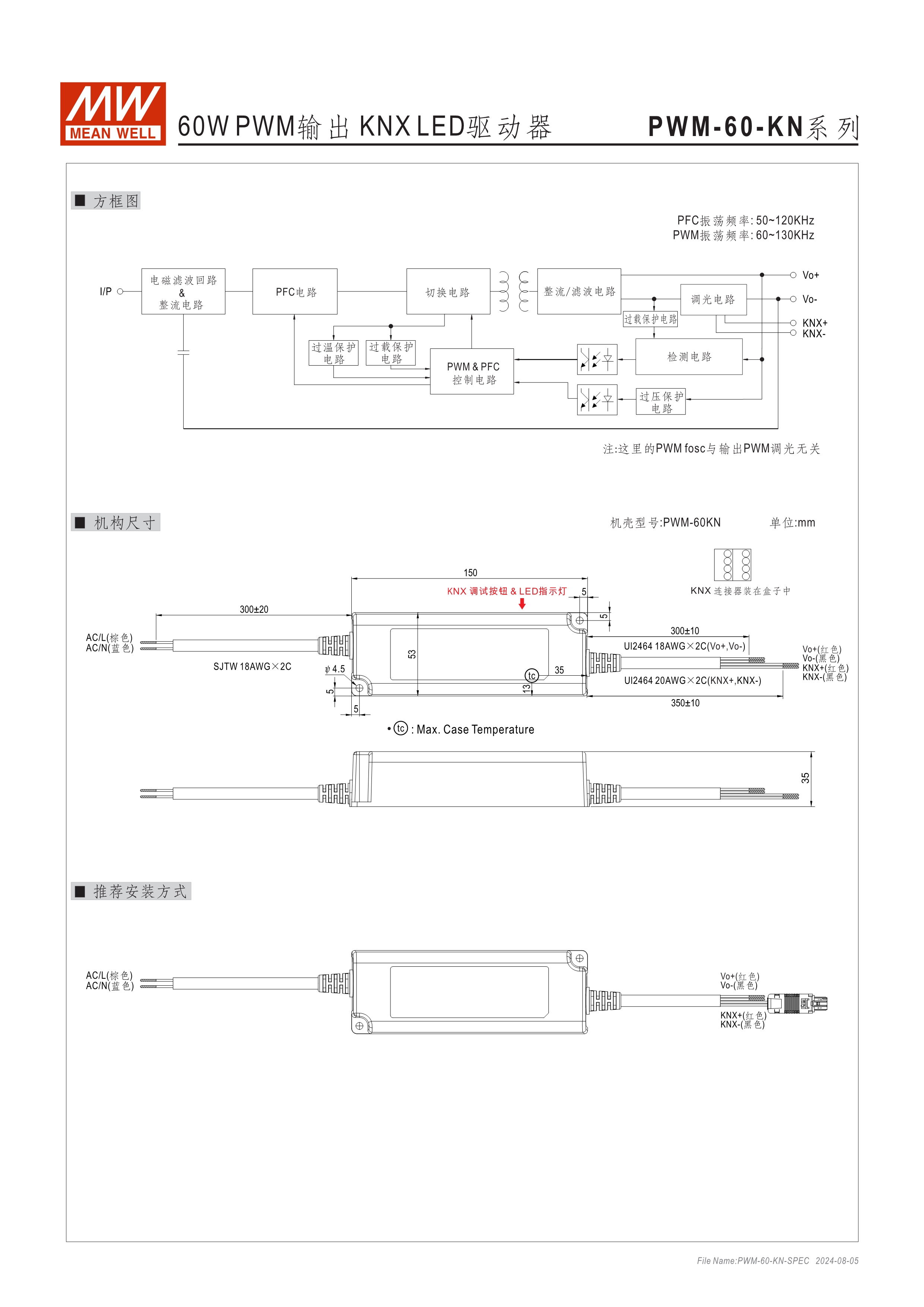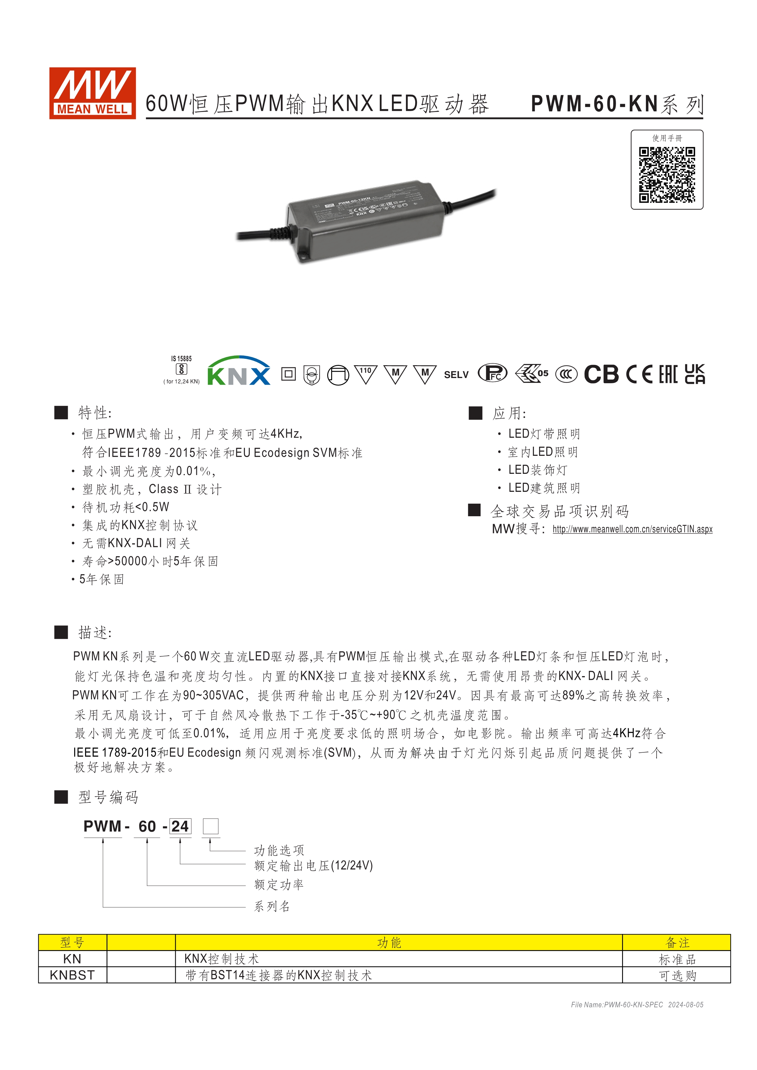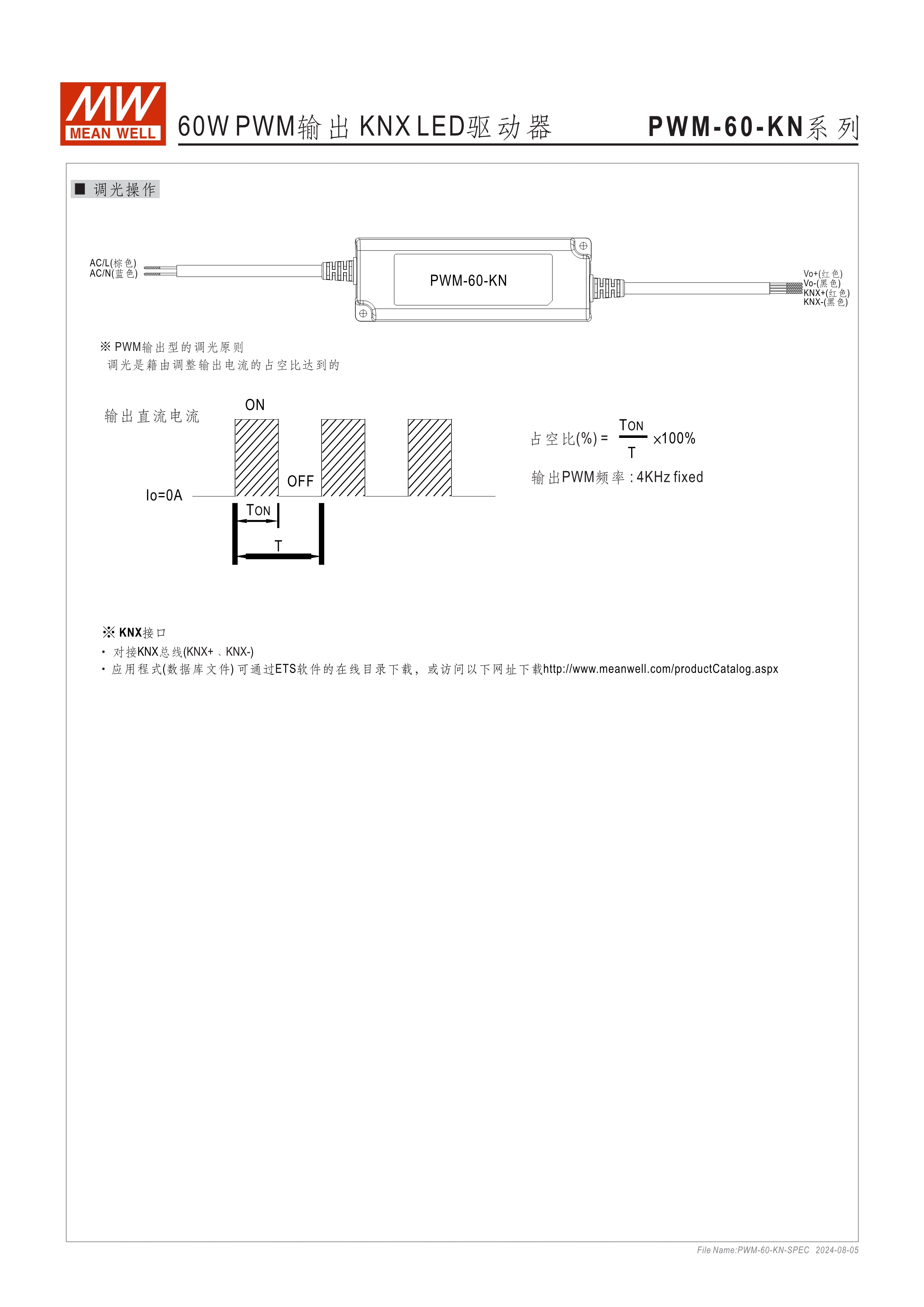 恒壓PWM型式輸出,用戶可調整工作頻率高達4KHz 內建主動式PFC 功能 空載功耗<0.5W/待機功耗<0.5W 整合KNX控制接口 不須KNX-DALI 網關