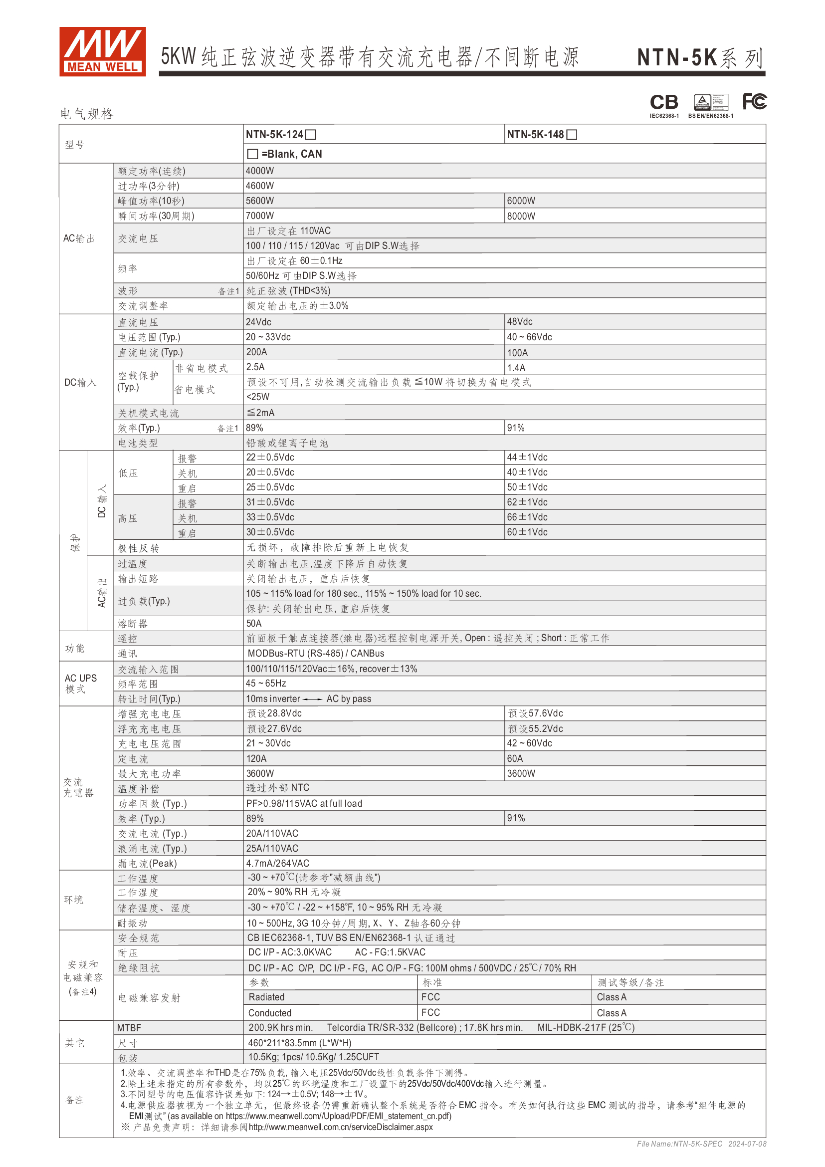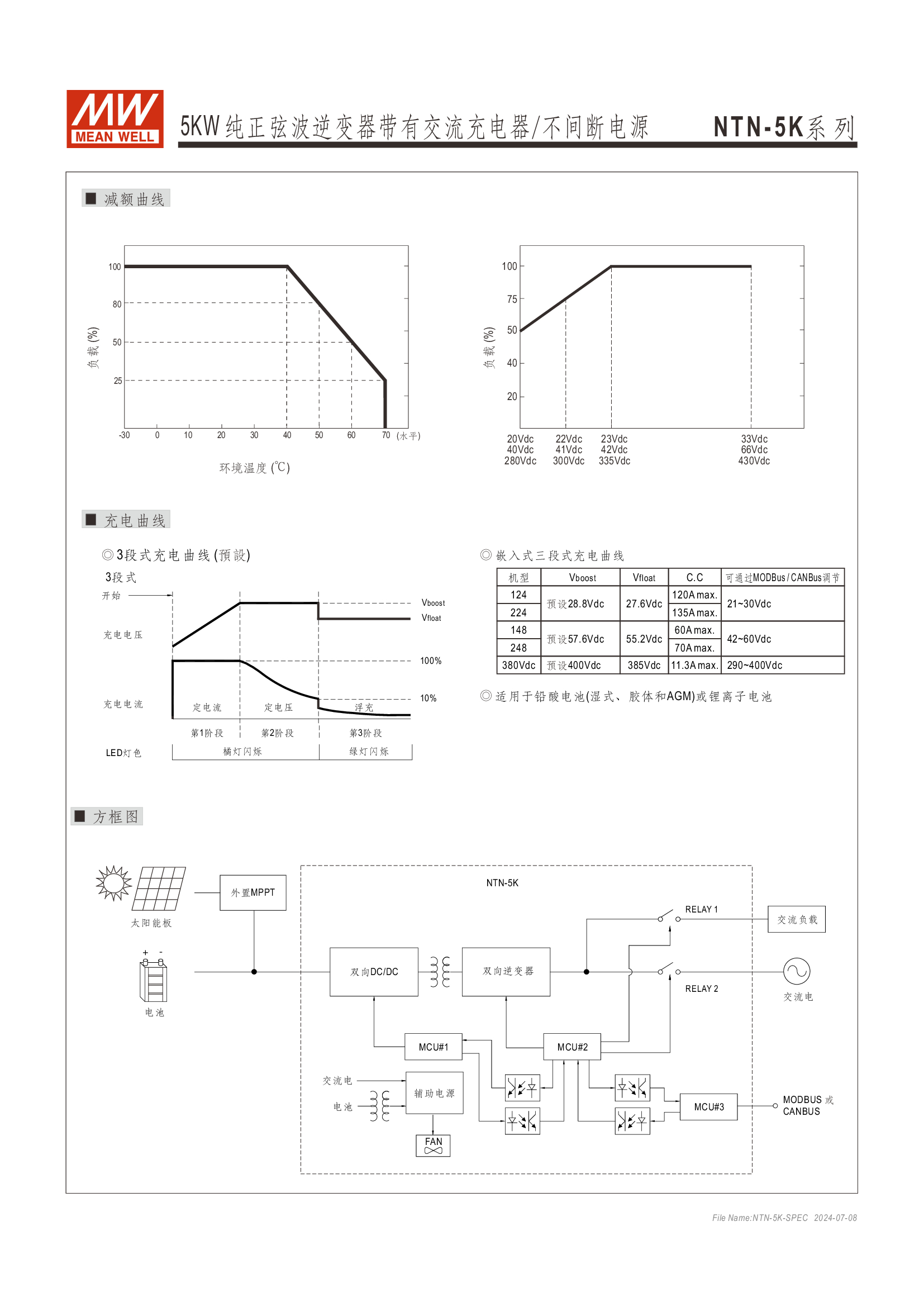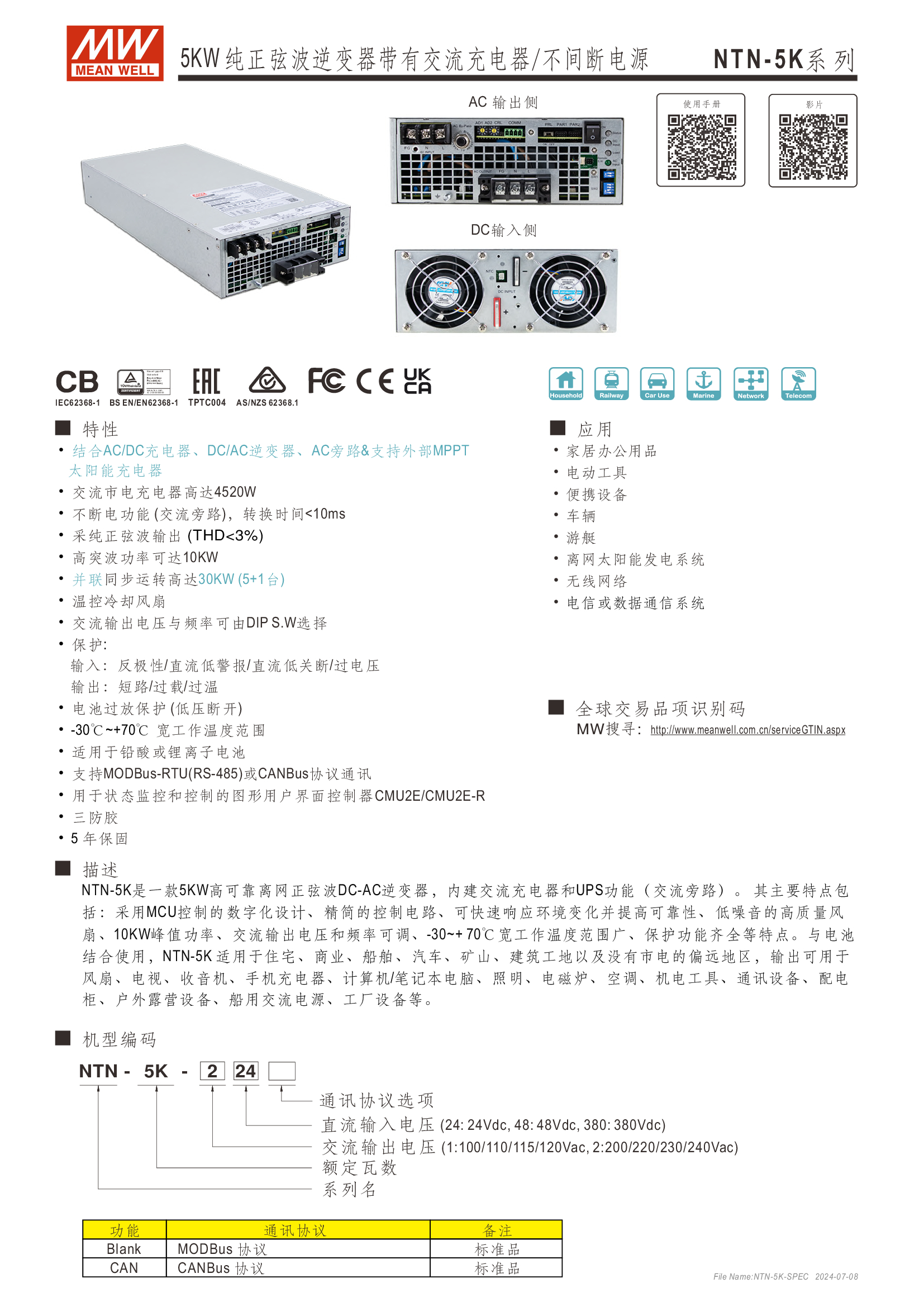 多功能一體機(jī) (AC-DC 充電器 + DC-AC 逆變供載 + AC 旁路供載) AC 市電充電最高可達(dá) 135A /4KW 可提供瞬間功率達(dá) 10KW 并聯(lián)同步運(yùn)行高達(dá) 30KW(5+1 機(jī)組) 多重智能保護(hù)功能: 直流輸入:極性反接/ 低壓告警與關(guān)機(jī)/ 過壓 /電池過放電保護(hù) 交流輸出:短路/ 過載/ 過溫 內(nèi)建 MODBus 或 CANBus 通訊監(jiān)控 5 年保固