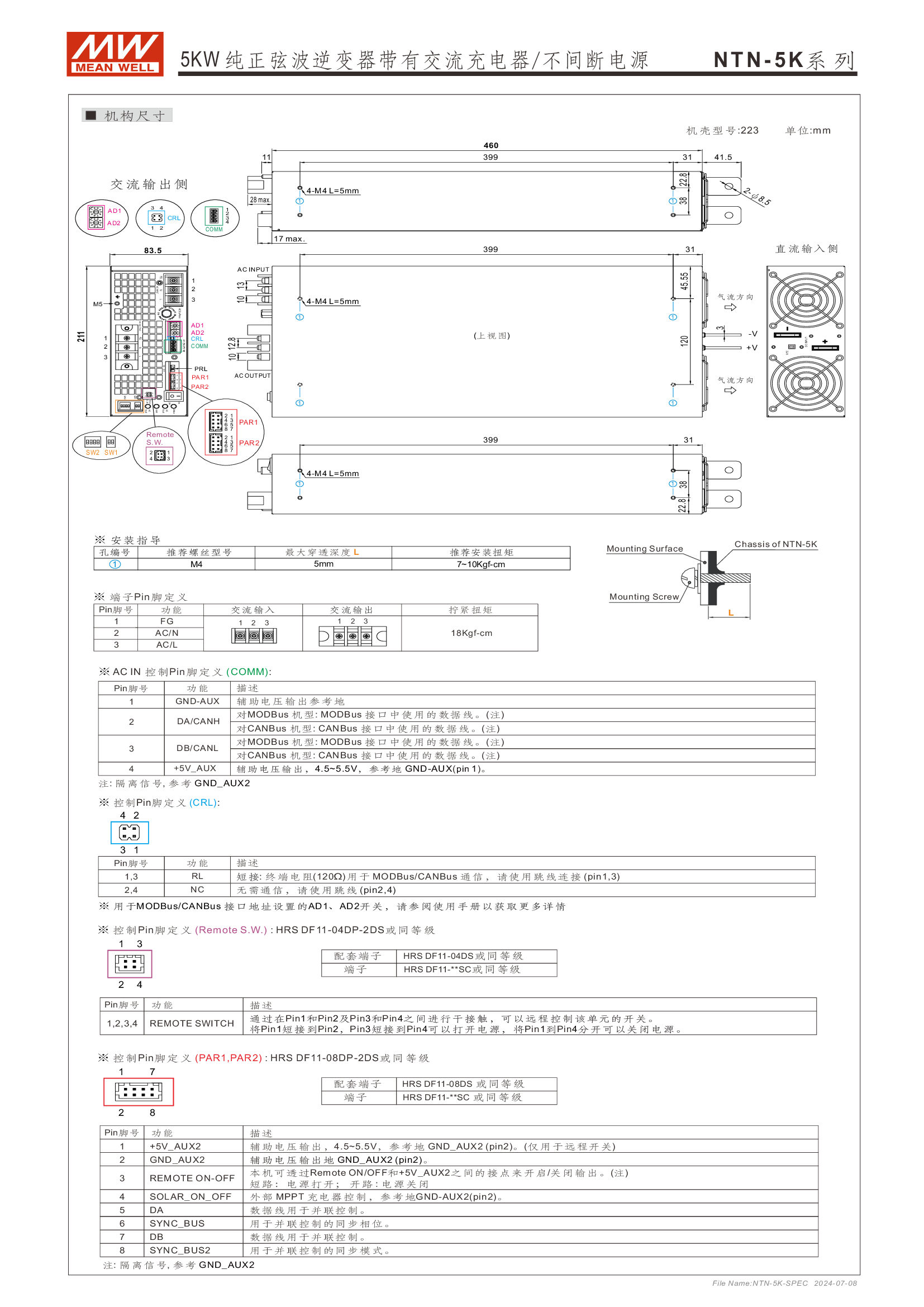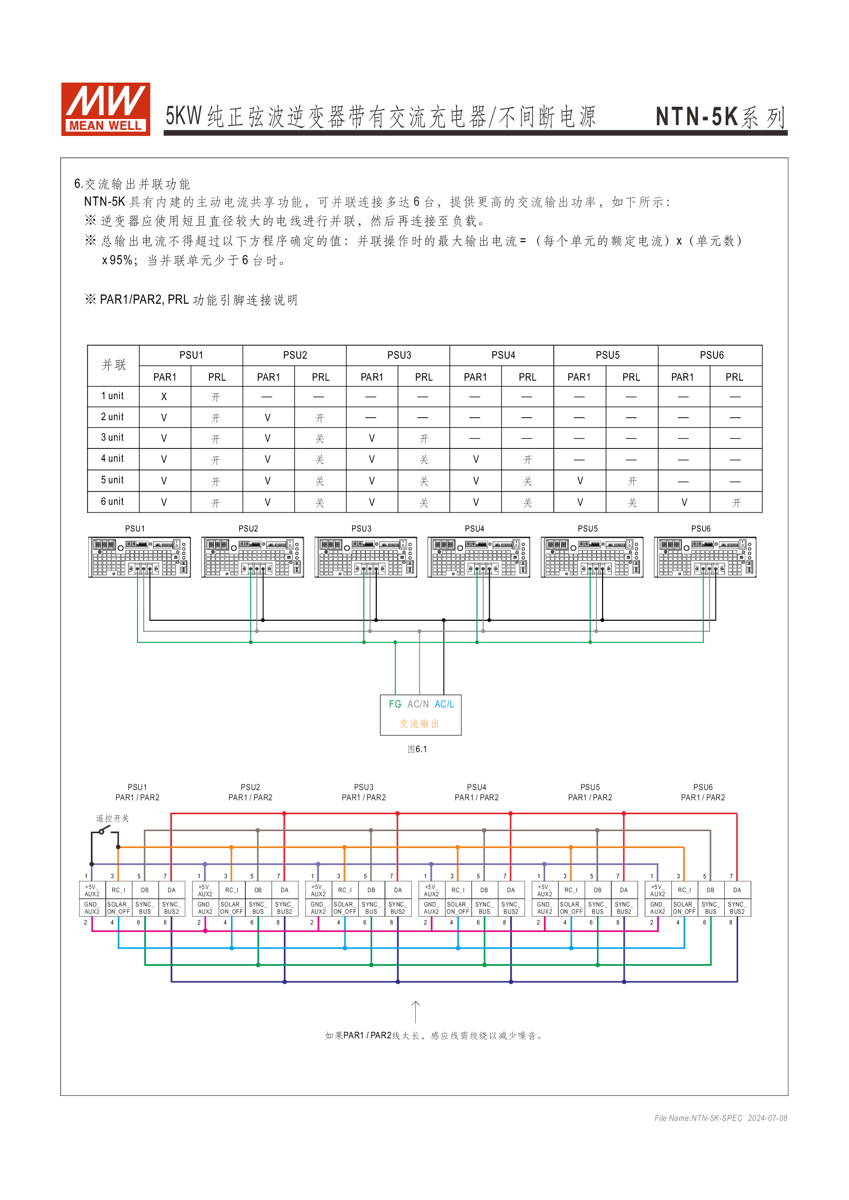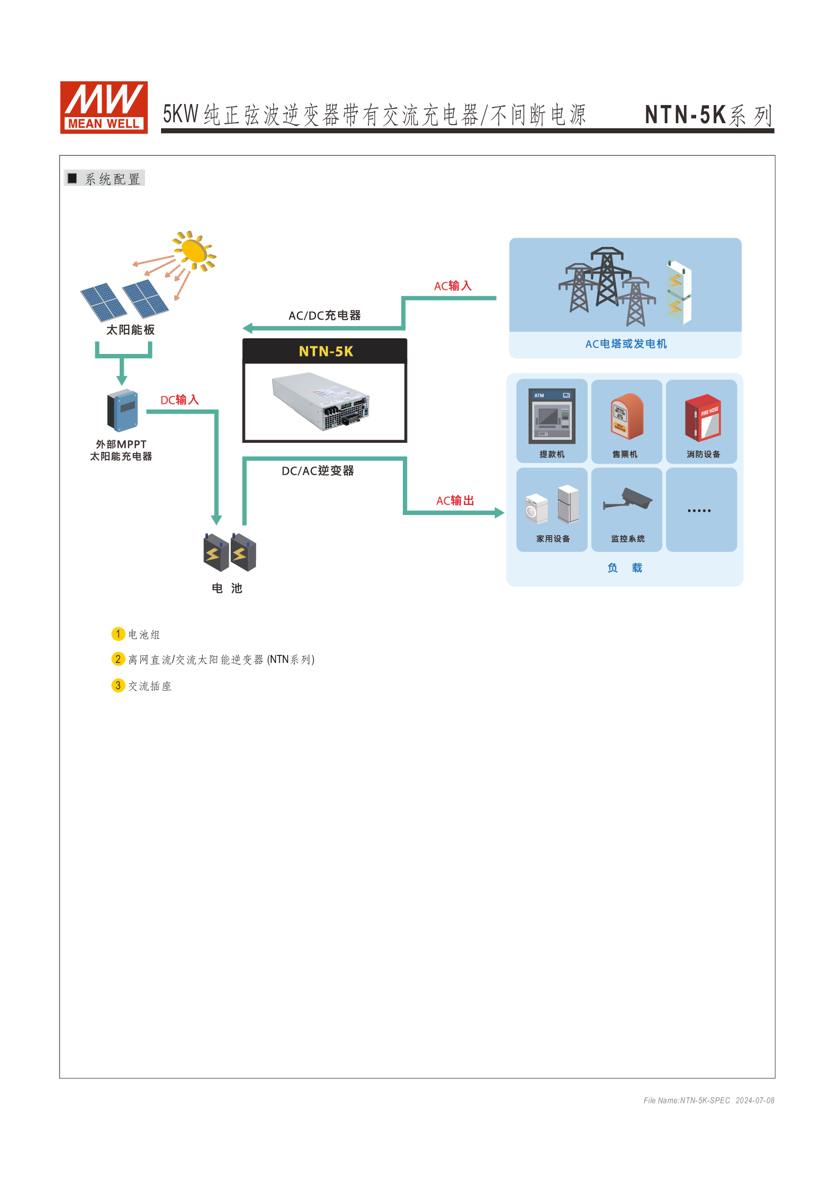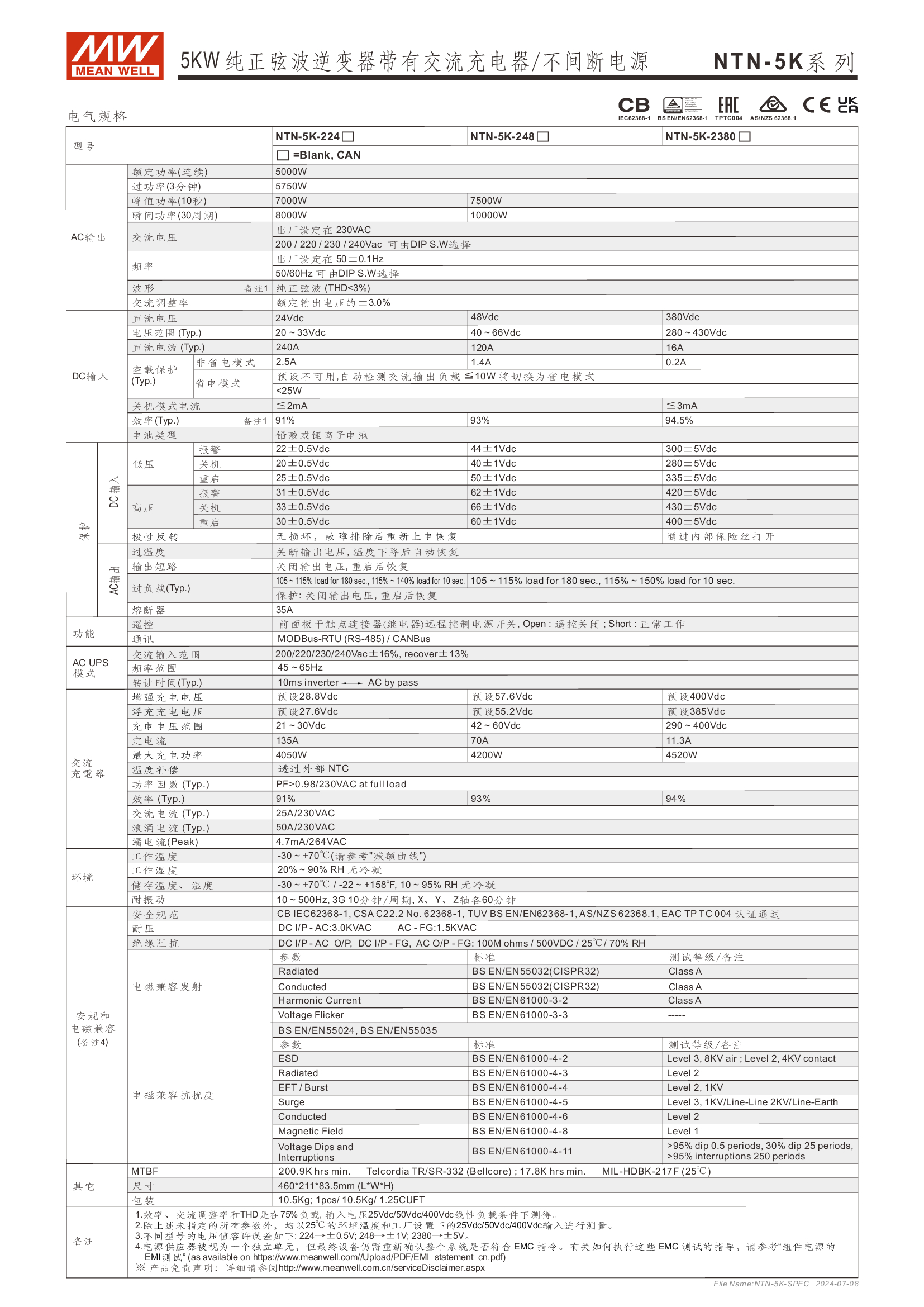 多功能一體機(jī) (AC-DC 充電器 + DC-AC 逆變供載 + AC 旁路供載) AC 市電充電最高可達(dá) 135A /4KW 可提供瞬間功率達(dá) 10KW 并聯(lián)同步運(yùn)行高達(dá) 30KW(5+1 機(jī)組) 多重智能保護(hù)功能: 直流輸入:極性反接/ 低壓告警與關(guān)機(jī)/ 過壓 /電池過放電保護(hù) 交流輸出:短路/ 過載/ 過溫 內(nèi)建 MODBus 或 CANBus 通訊監(jiān)控 5 年保固
