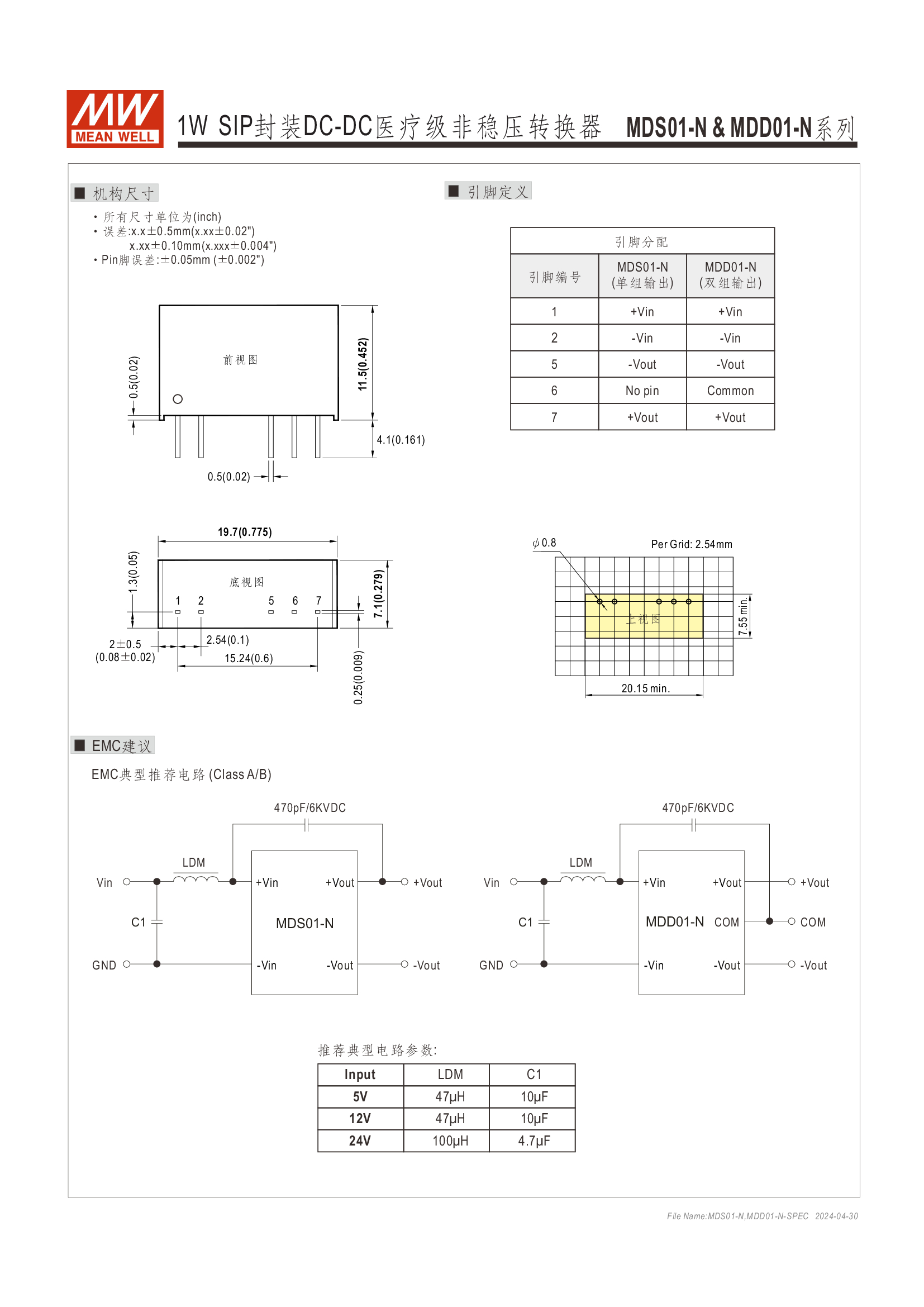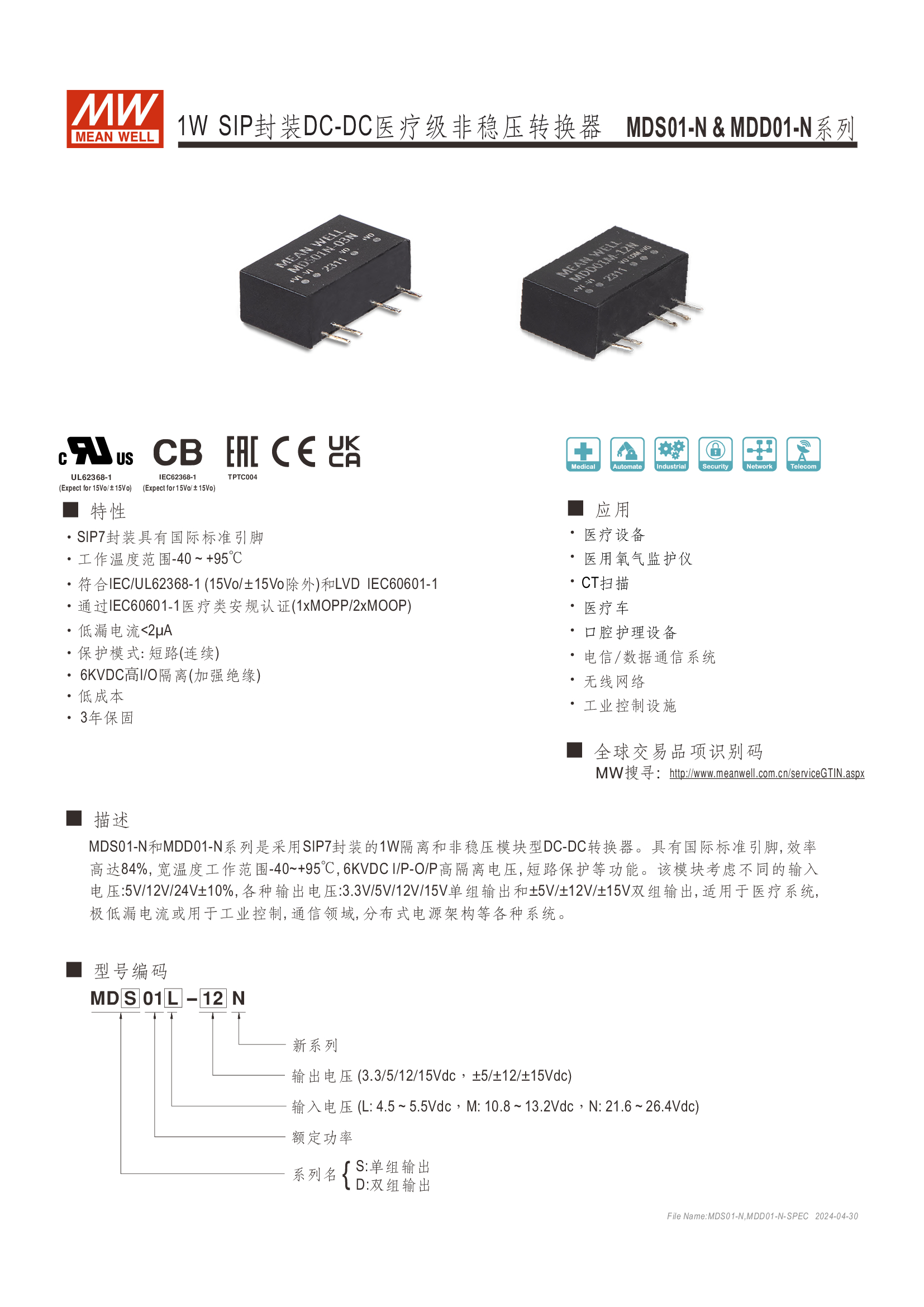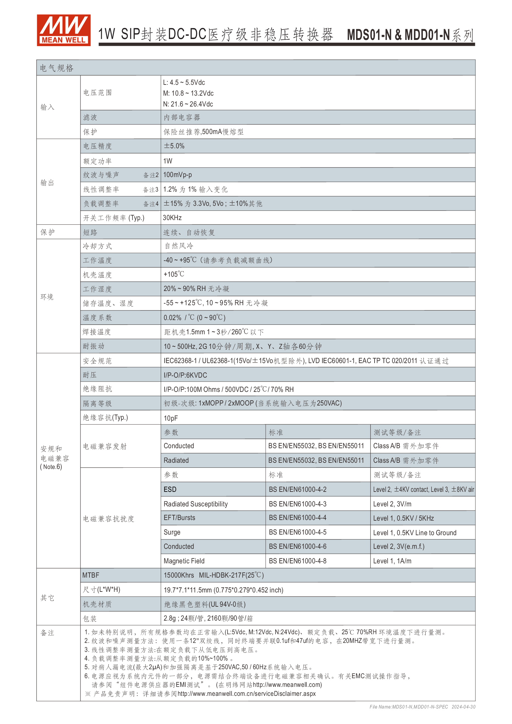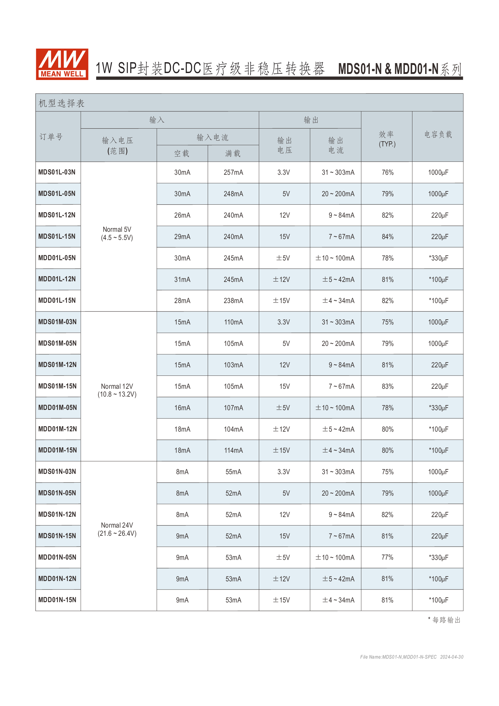 模塊型快選表 SIP7 單排封裝國際標(biāo)準(zhǔn)引腳 (1~3W); DIP24 單排封裝國際標(biāo)準(zhǔn)引腳 工作溫度:-40 ~ +90℃ (不需降載) 通過醫(yī)療認(rèn)證ANSI/AAMI ES60601-1 (1×MOPP/2×MOOP) 超低病患泄漏電流 <2μA(1~3W); 超低病患泄漏電流 <5μA (3~6W) 保護功能:短路保護(3秒) / 過負(fù)載保護 (3~6W) 3年保固期