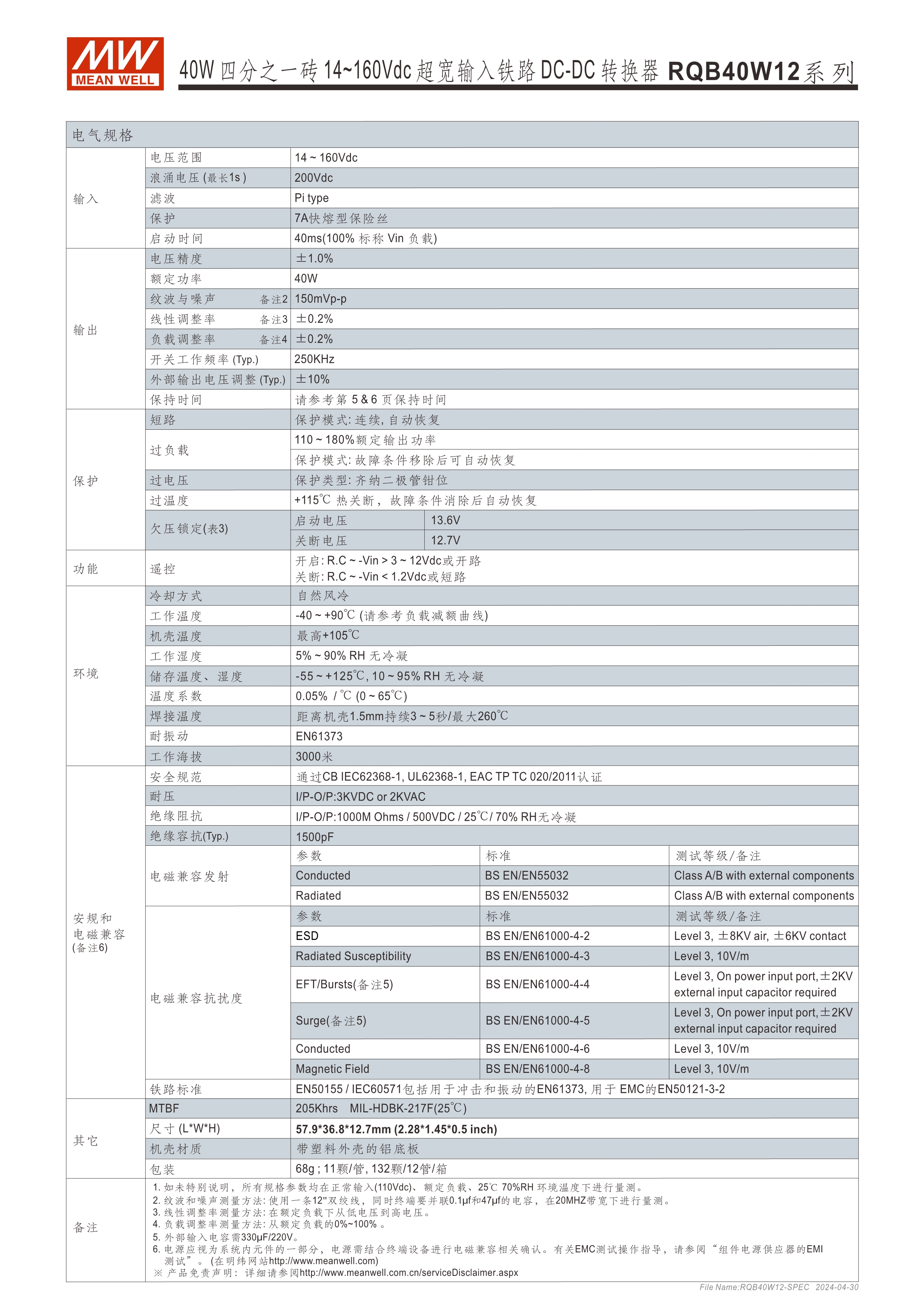 模塊型快選表 2.28” x 1.45” x 0.5”半磚尺寸 符合鐵路標準EN50155 40W: 12:1(14~160Vdc)超寬輸入范圍 ; 150W: 3:1(60~160Vdc)超寬輸入范圍 寬工作溫度范圍-40~+90oC 無需最低負荷 全封裝